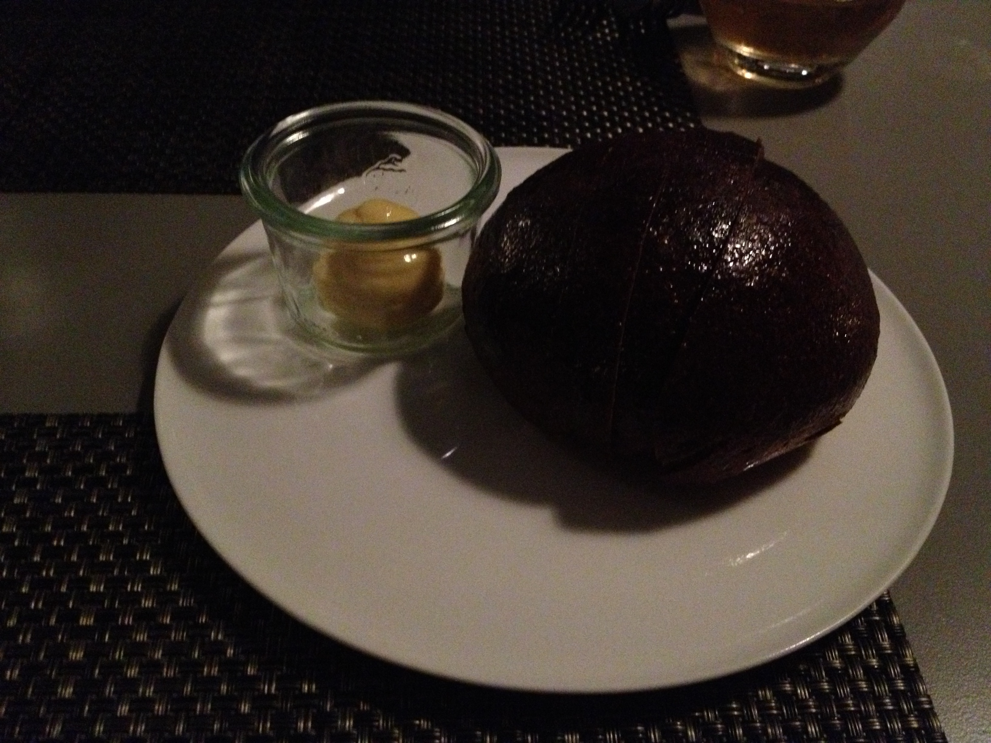 Now for the good stuff. This was our “pre dessert”, which you sadly can’t really see, but the insides of it were incredible. There was a carrot puree covered in a Greek yoghurt mousse (so delightfully tangy but also sweet), and in the very center was a tiny licorice cake. I don’t even like licorice but I loved this. The combination of all three flavours was just so innovative and I loved the use of carrot in the dessert. Plus the contrast of white, orange, and black once you broke into it was visually impactful as well.