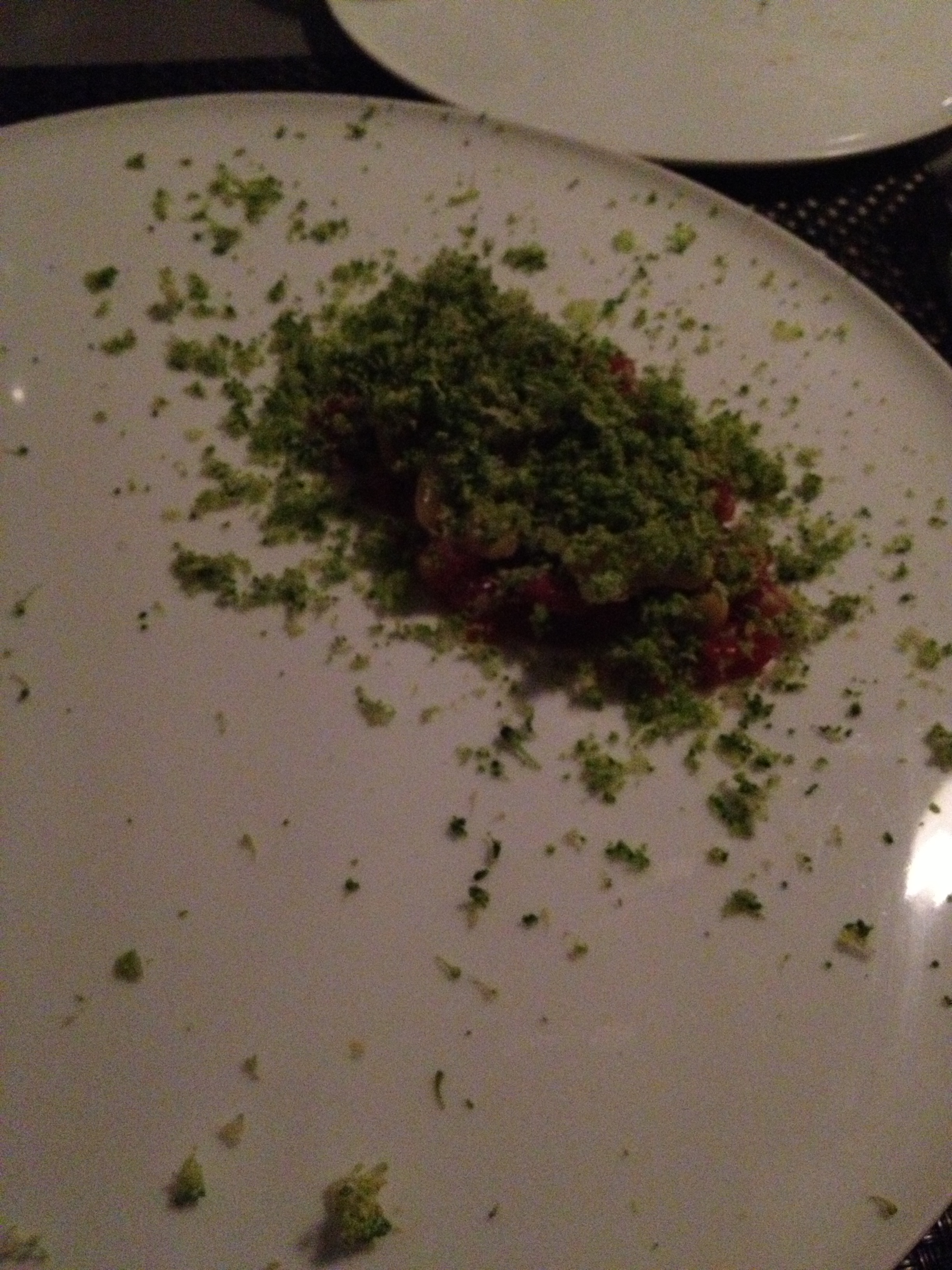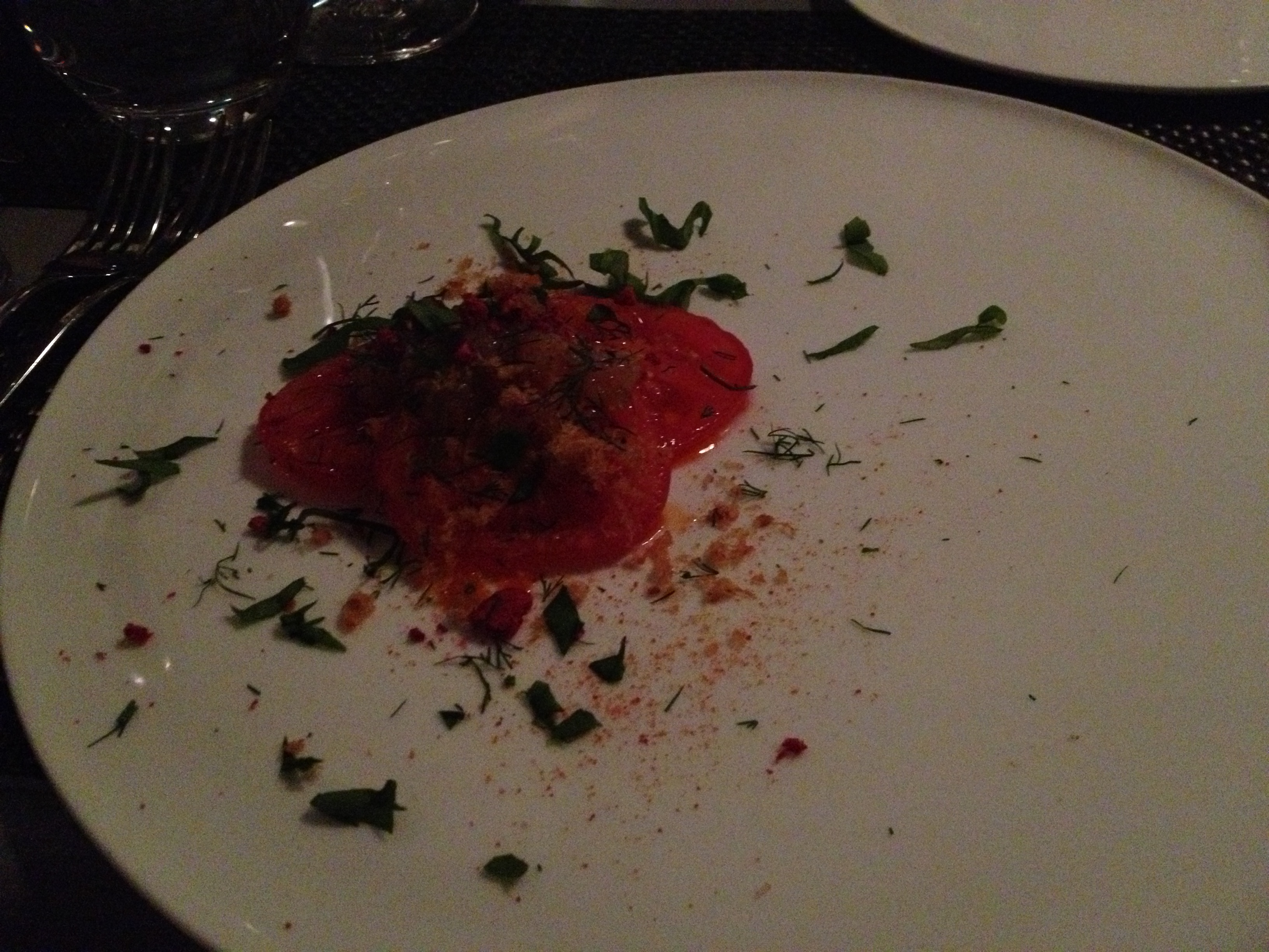 Sadly not great lighting, but this was a fantastic play on a BLT – this was called “bacon, lettuce, and bonito” – there was bacon, bonito flakes, and charred lettuce, with some sort of butter sauce. I honestly could have done without the butter sauce but the little dab of Meyer lemon curd on the plate was unbelievably delicious.