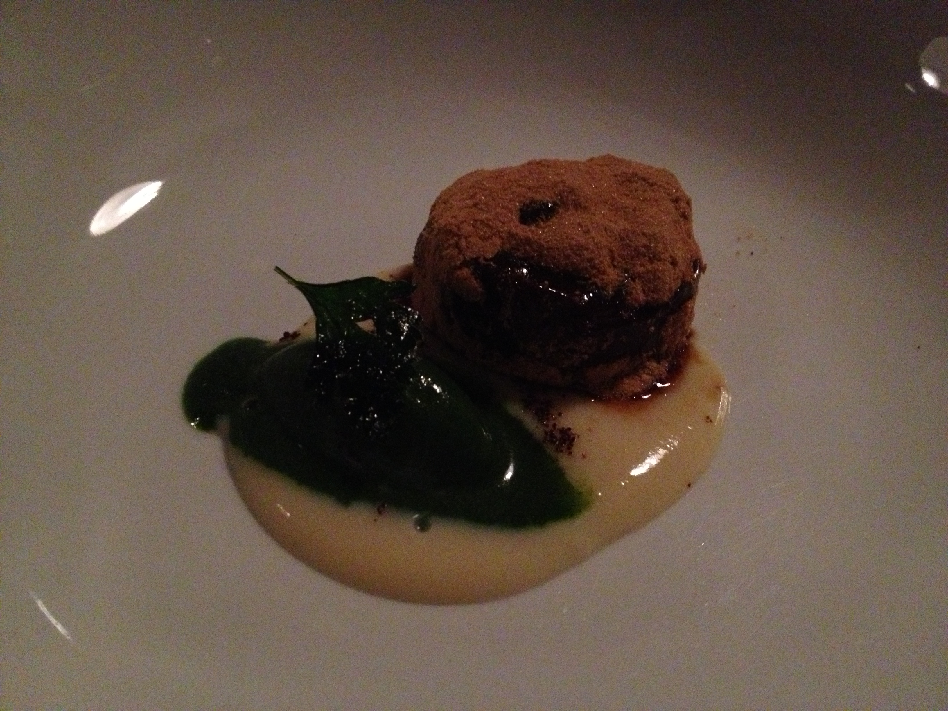 Similarly, this was listed on the menu as “pork and fennel” to which I was expected a Momofuku like post dessert of pork (semi ew, but potentially acceptable). These were actually like a modern day take on pork rinds – little pieces of dehydrated pork skin dipped in dark chocolate and sprinkled with fennel seeds. I was more delighted by the popcorn powder craziness, but this was also a lovely surprise and I was very impressed by the innovation.