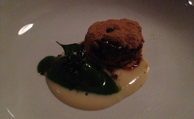 Omg. One of the best desserts, hands down, that I’ve had in Sydney. (rivaled by desserts at Quay and Sepia of course, but still…totally in the same league) This was a double chocolate mousse (be still, my heart) rolled in malt powder over a banana custard with…get this – PARSLEY sorbet. The photo does not do justice to the brilliant colours of this dish, much less the amazing taste! I was absolutely blown away by how innovative and utterly delicious this was. The chocolate was really dark and rich, and the parsley sorbet cut through that and provided an amazing contrast. Plus, malt and banana? So many good things in one tiny little package – it packed quite the dessert punch.