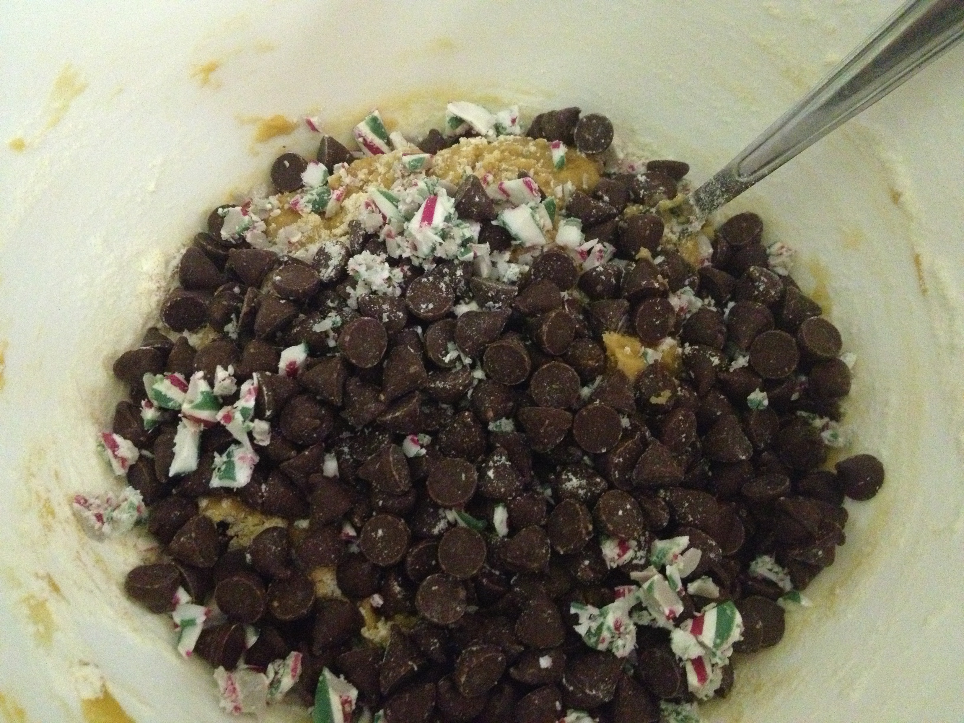 After the flour is added, just dump in a whole bunch of chocolate chips and crushed candy canes