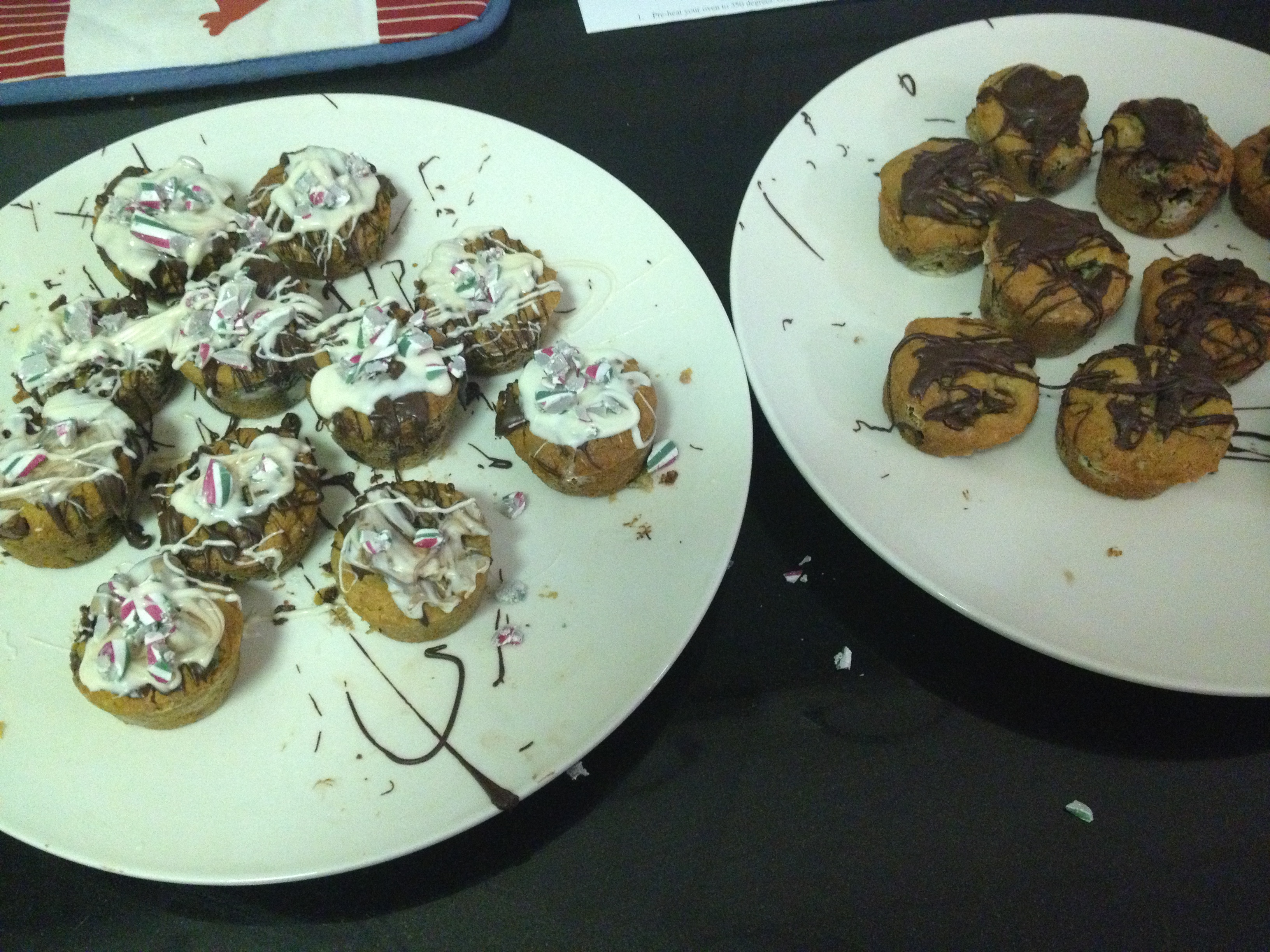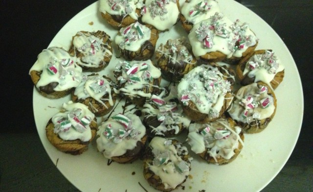 For the dough, do your usual butter and both sugars creaming. Then add the vanilla and egg and mix well. Add the baking soda and salt, followed by the following, mixing slowly to incorporate. Then add the chocolate chips and about half of the crushed candy canes and mix it all in. Scoop spoonfuls of the batter into each mini muffin cup. They should all be filled a bit more than half way – the recipe makes more than 24, and I only have capacity for 24, so you can save some of the dough for another time or you can just fill them up till they overflow a little. Bake for about 12 minutes until a toothpick comes out clean and they are nicely browned (but not too brown!). Per usual, you definitely don’t want to overbake and all ovens are different, so check them at about 9 minutes.