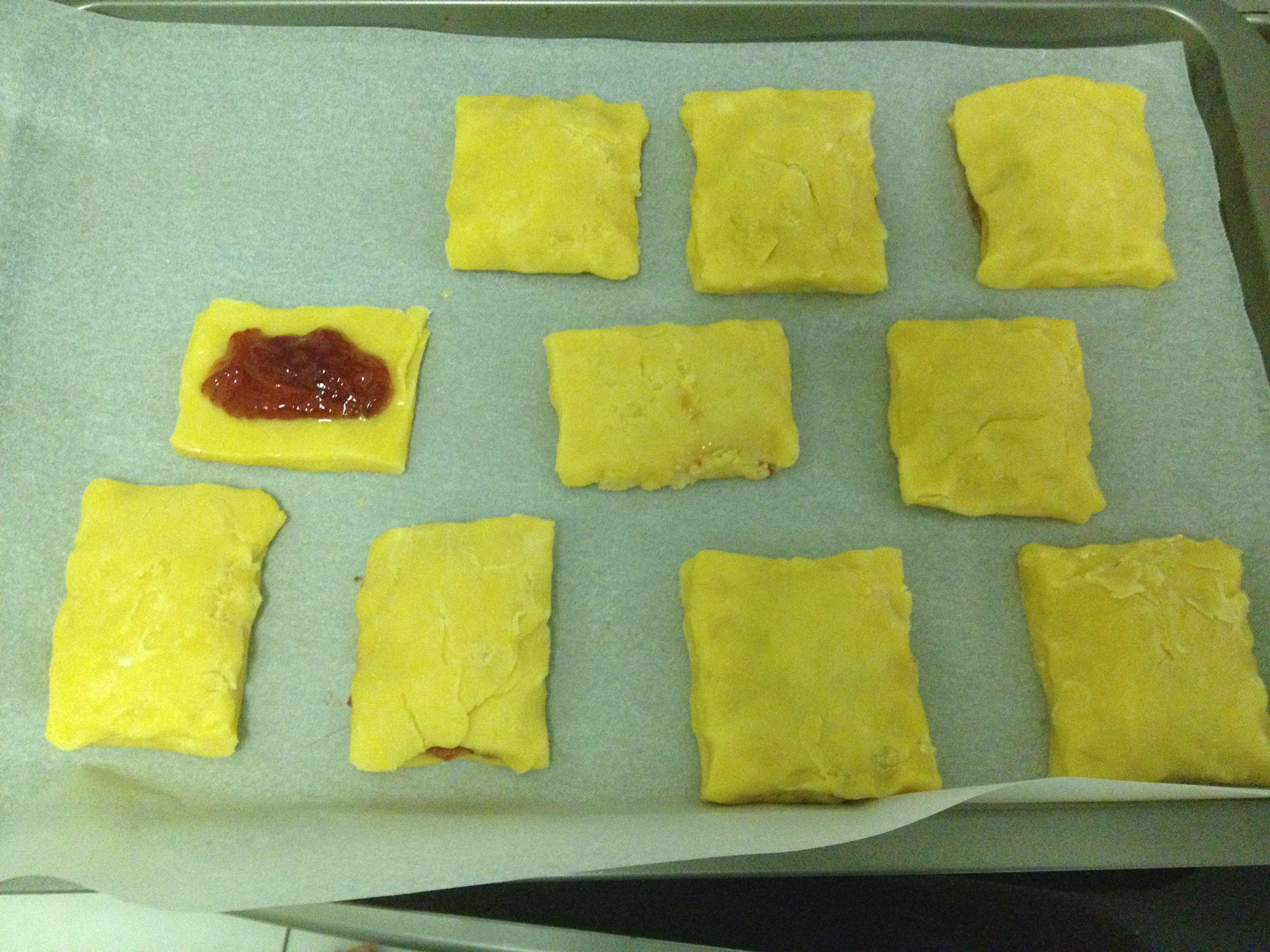 Creating the dough squares. I made mine kind of small. You just have to roll it out (or in my case press it down a lot with your hands) and then use a sharp knife to cut out squares or rectangles