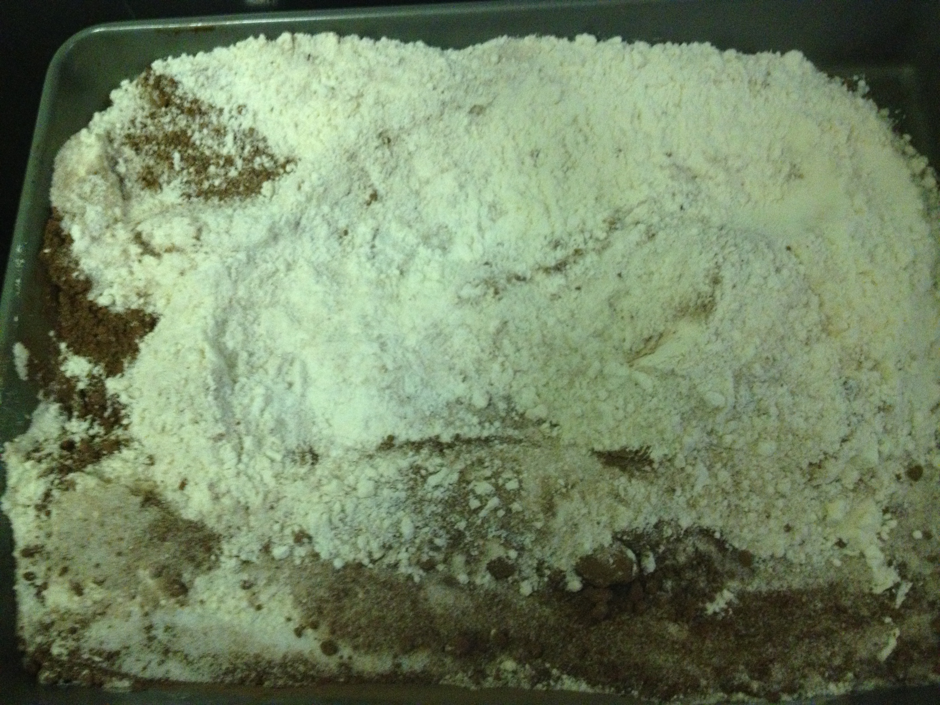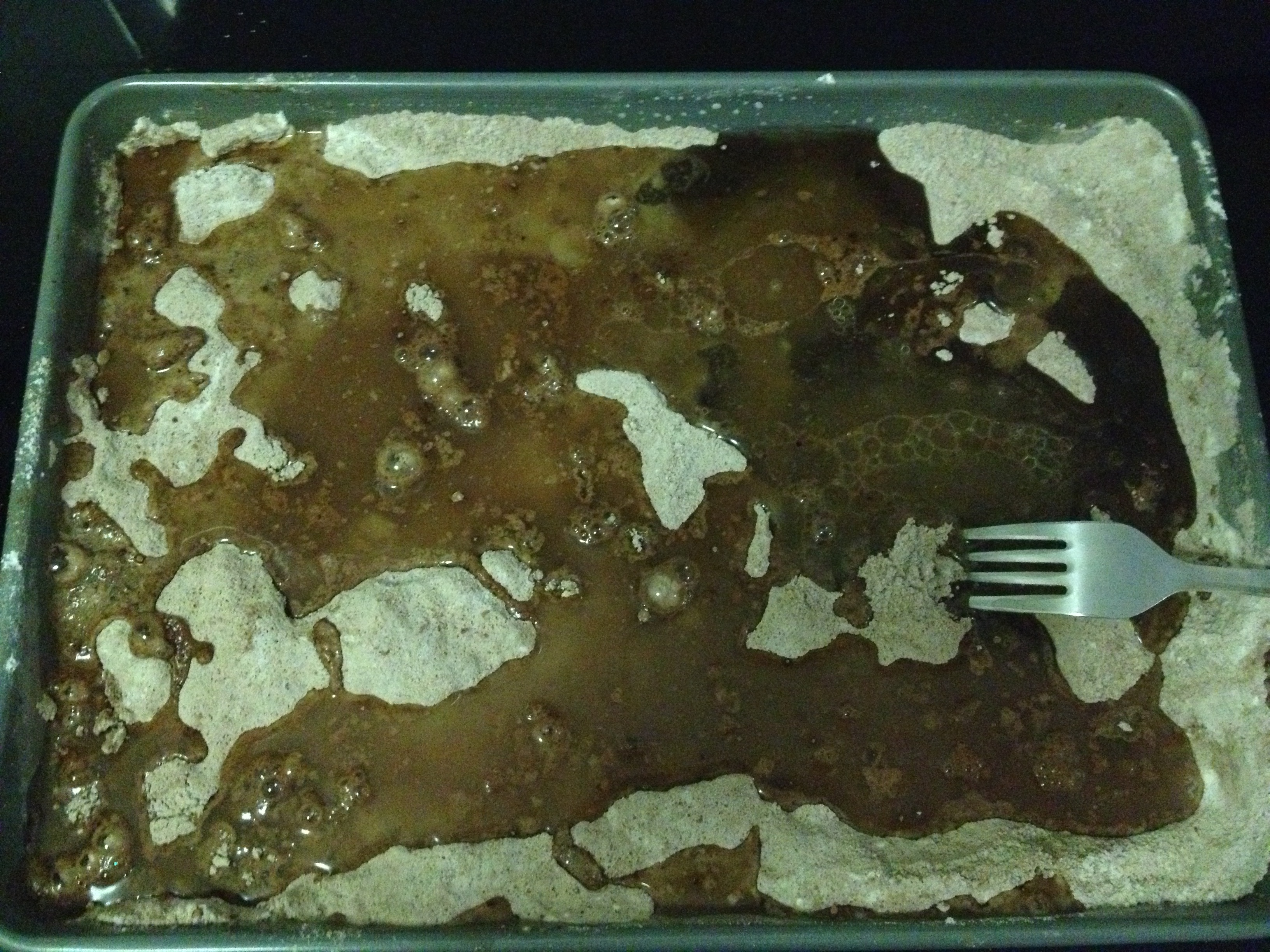 For the cake, measure all the dry ingredients into a round or square cake pan. I used a rectangular one that was a bit less deep, but if you’re using a square or round one make sure it’s at least 2 inches or 5 cm deep. Blend all the dry ingredients together right in the pan. Yes that’s right, just dump them all in there and mix it up. Then, make two little wells in the dry ingredients, and pour the vanilla extract into the first and the vegetable oil into the second.