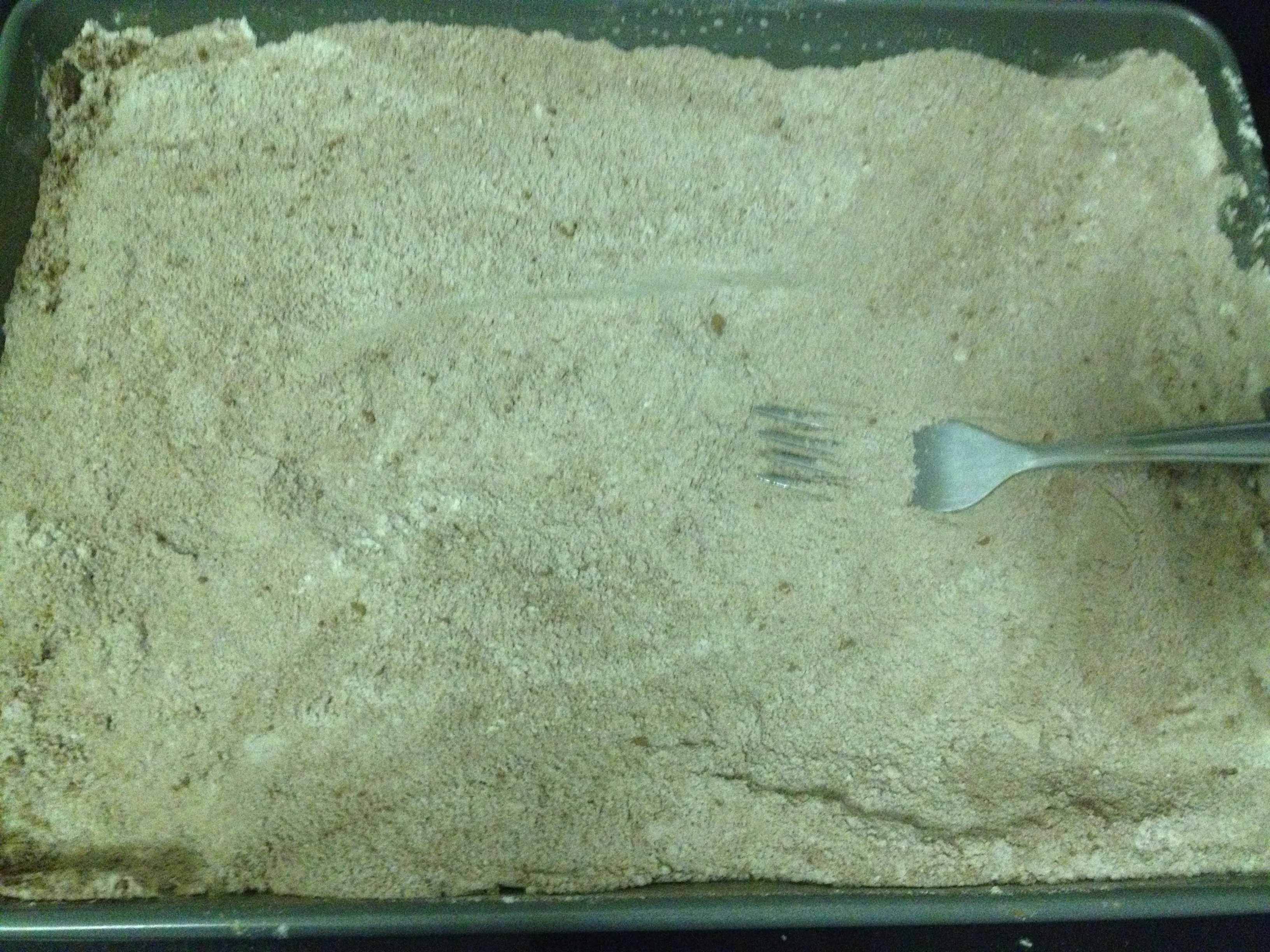 Take the cup of cold water and pour it directly over everything in the pan. Stir all the ingredients together with your fork until they are well blended. Then it is just ready to go and pop into the oven! Bake it for 30 to 35 minutes or until a toothpick or knife inserted in the centre comes out clean.