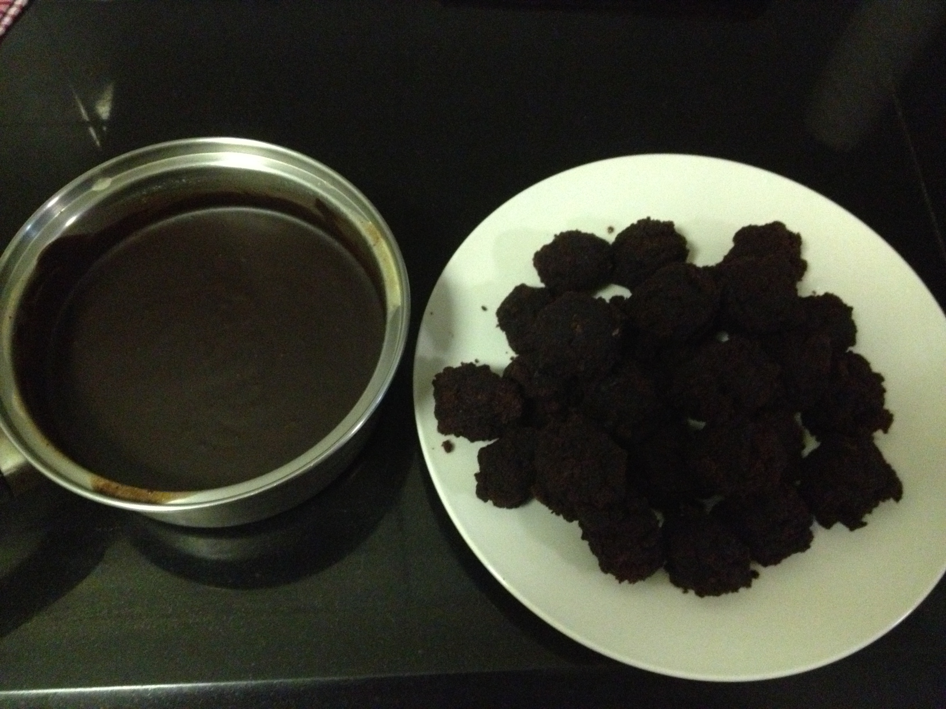 Cake balls assembled on the right and set ganache on the left – let’s do this