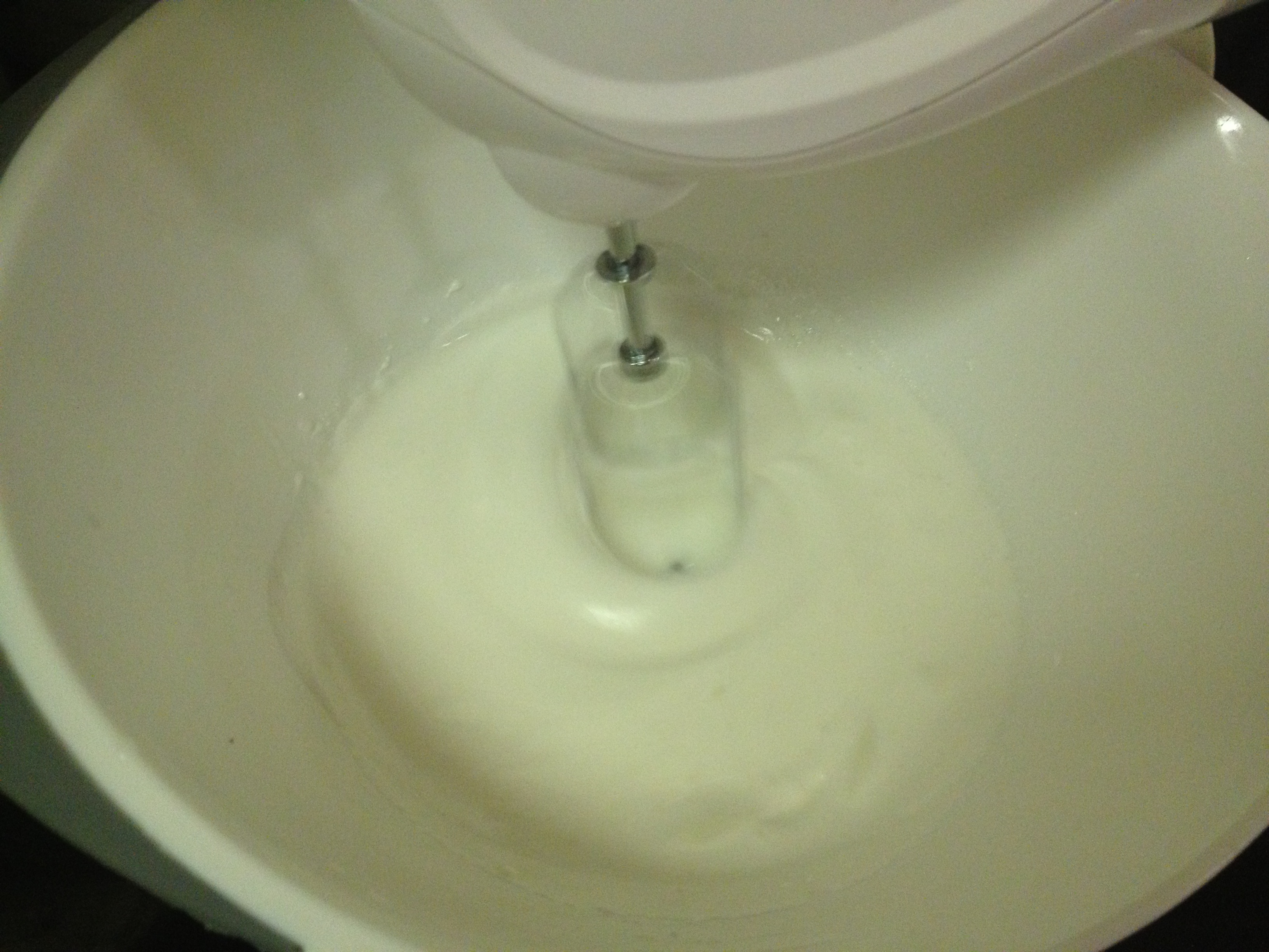 To make the meringue is incredibly easy – just whip your egg whites up real nice and when they start to get frothy (hint: use an electric mixer – even I, who never even uses a mixer to cream butter and sugar, makes meringue with an electric mixer) add in the pinch of salt and the sugar. Your meringue is done when the egg whites form stiff peaks – meaning you can take a fork and lift up the egg white batter and it will be stiff enough to hold its shape.