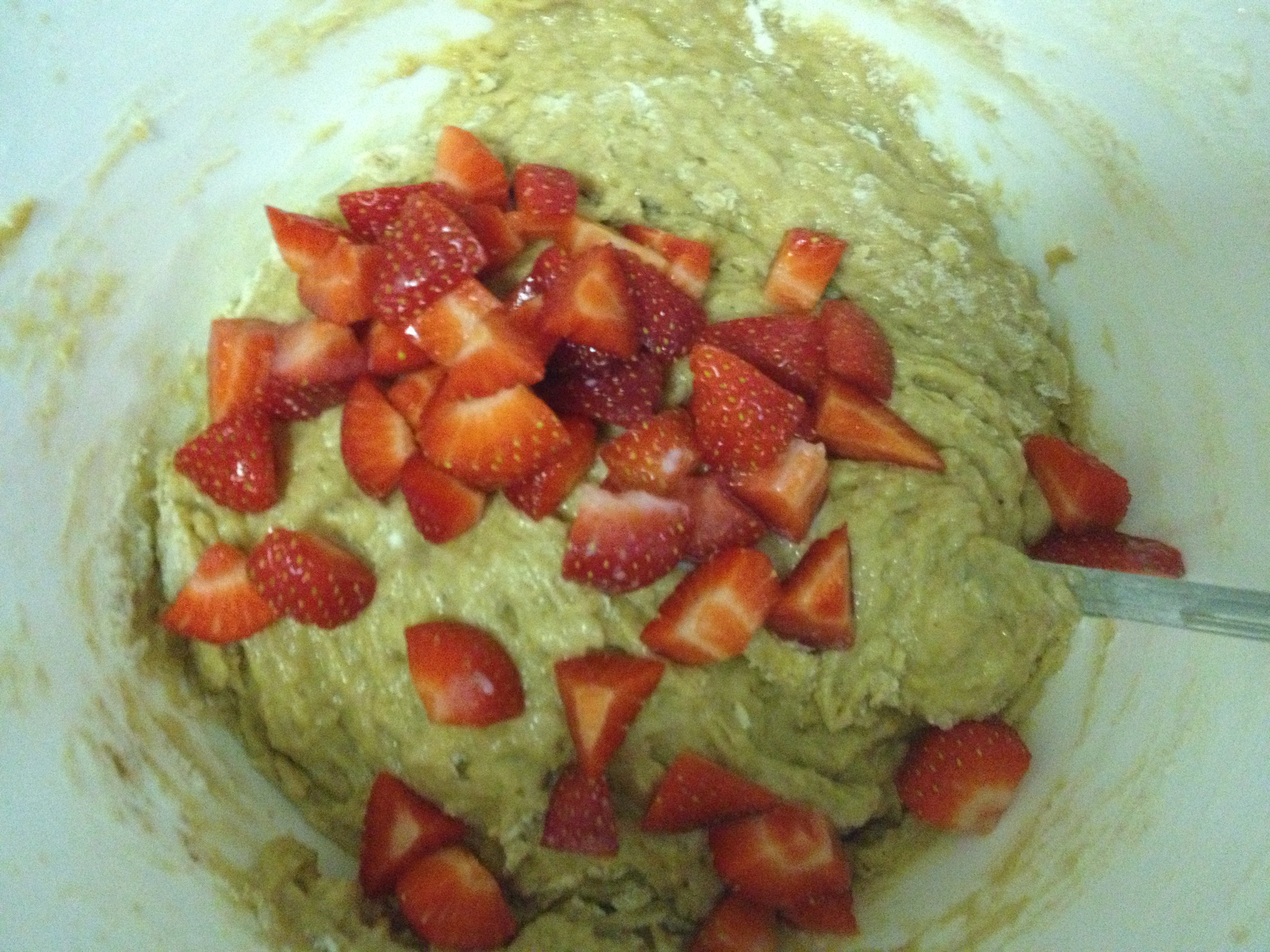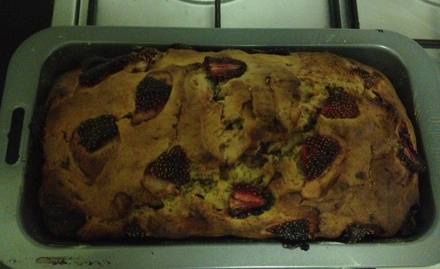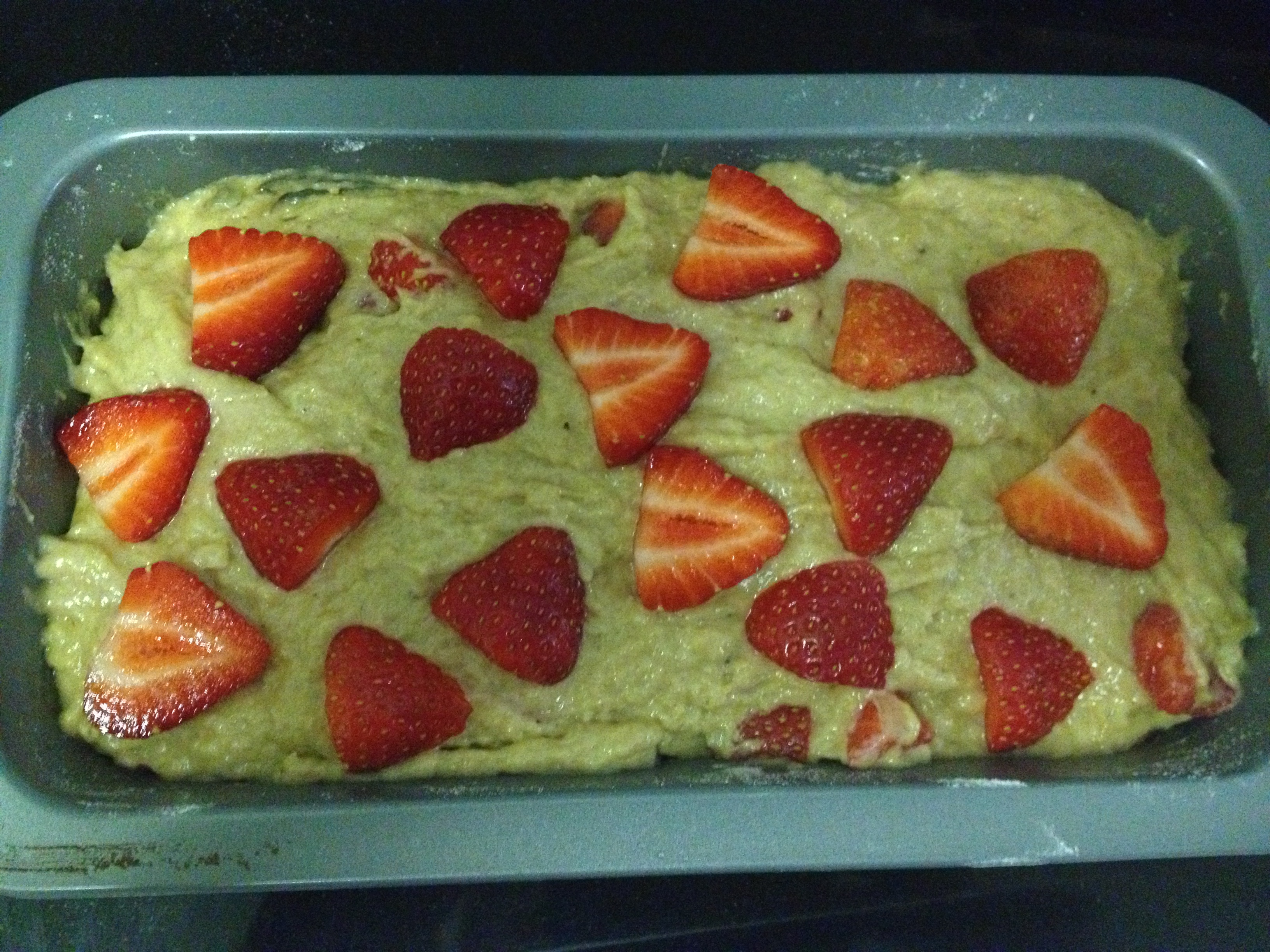 And sprinkle remaining sliced strawberries on the top of the loaf before putting in the oven