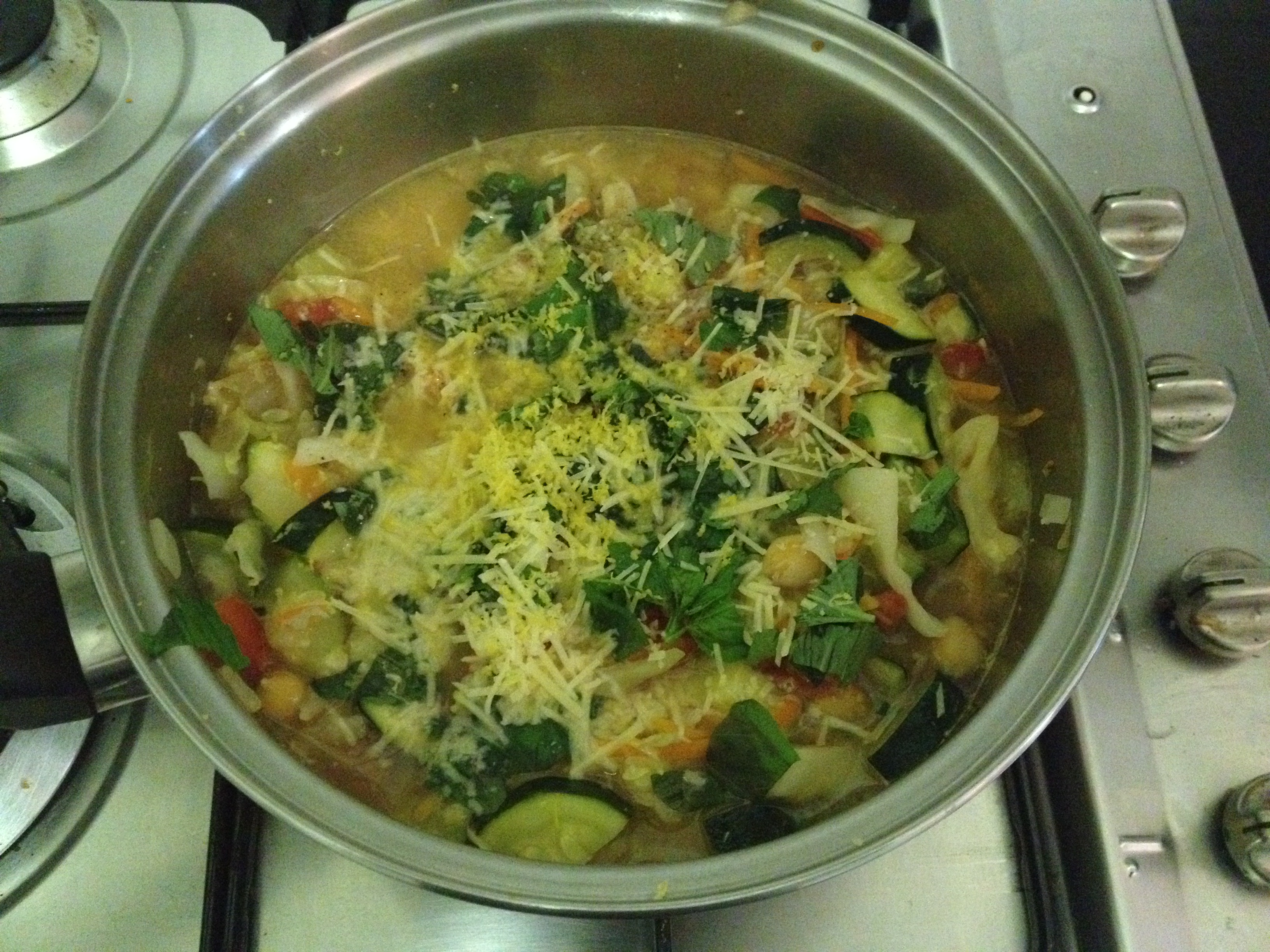 Add the zucchini and tomatoes, stir to coat, and then add the stock, chickpeas, and parmesan rind if using. (I just got some grated parmesan in a bag so didn’t have a rind). Keep the broth on a simmer as the zucchini cooks pretty quickly. When the veggies are almost tender, add the cabbage and peas, wait a minute or two, and then add your grated parmesan. Add some salt and pepper to taste. Remove from the heat, add the lemon rind and juice, and top with basil and mint to serve.