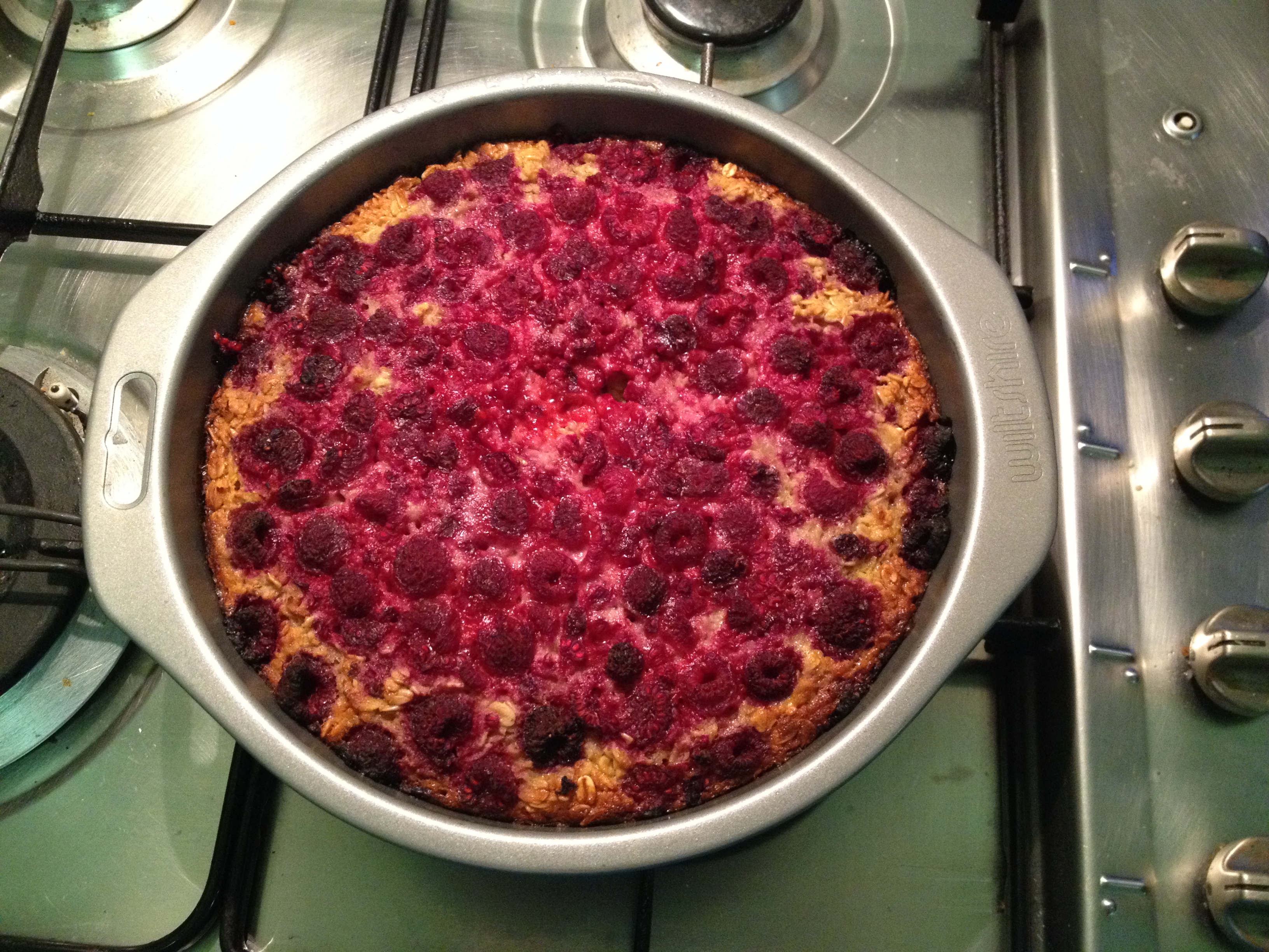 In a bowl, stir together the eggs, melted butter or oil, applesauce, milk, and sugar. Sprinkle the salt and baking powder over the mixture, and then add in all the oats. Stir thoroughly. Pour the mixture into the pan. Then gently stir the berries into the batter when it’s already in the pan. Frozen berries tend to bleed everywhere so be quite careful with them as you don’t want the oatmeal to become totally red or blue coloured. I actually just dropped mine on the top so they weren’t throughout the final product, but it was still delicious.