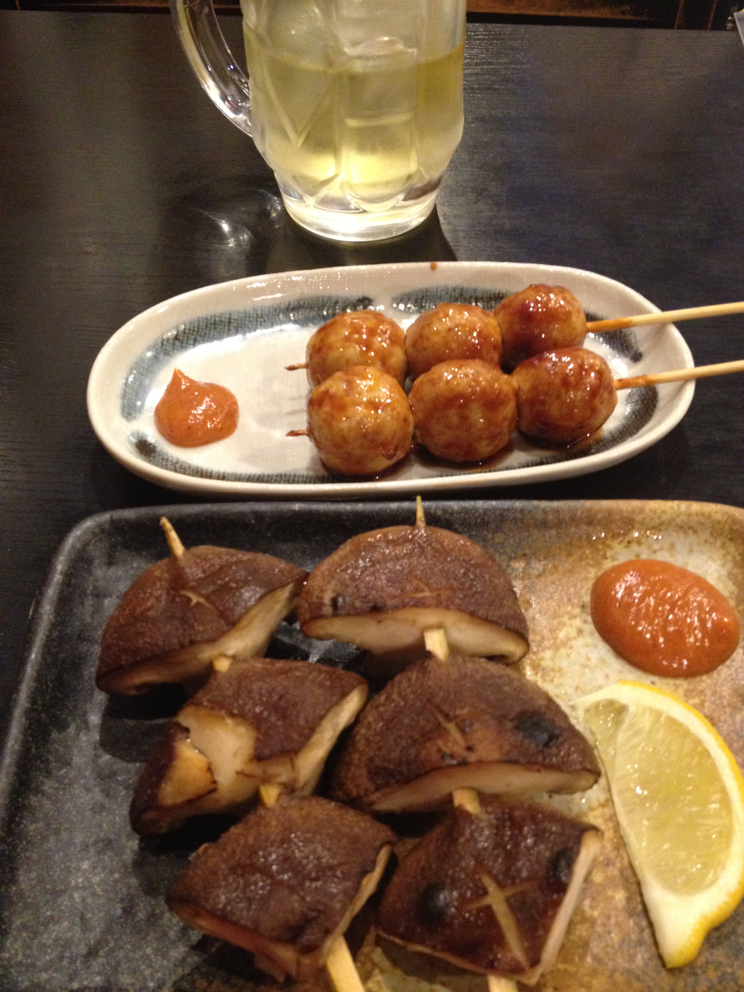 Above is a mug of iced green tea and some delightful chicken meatball and mushroom yakitori skewers. A big thing after work in Tokyo is to go to little bars and get some of these delicious little bites to go with your beer. They are all fresh and hot and amazing.