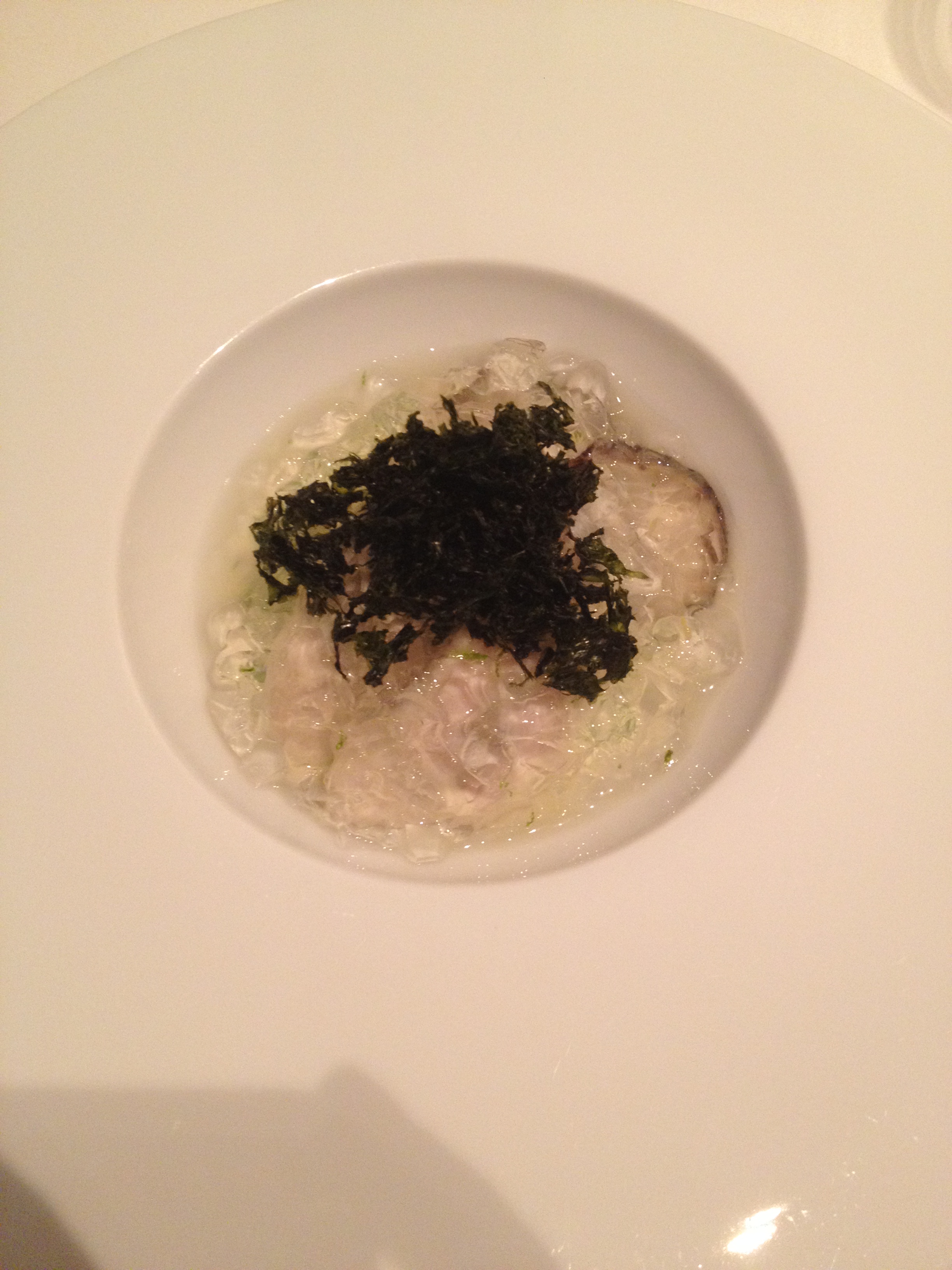 The first course was…interesting. It was oyster-centric which was a bit difficult because honestly I’m not a fan of oysters. On the bottom there was an oyster mousse, a dabble of lemon and lime jelly, then actual oysters, and then seaweed on top. I struggled here, not gonna lie. I just can’t do oysters in most circumstances. If I liked them though I’m sure I would have enjoyed this.