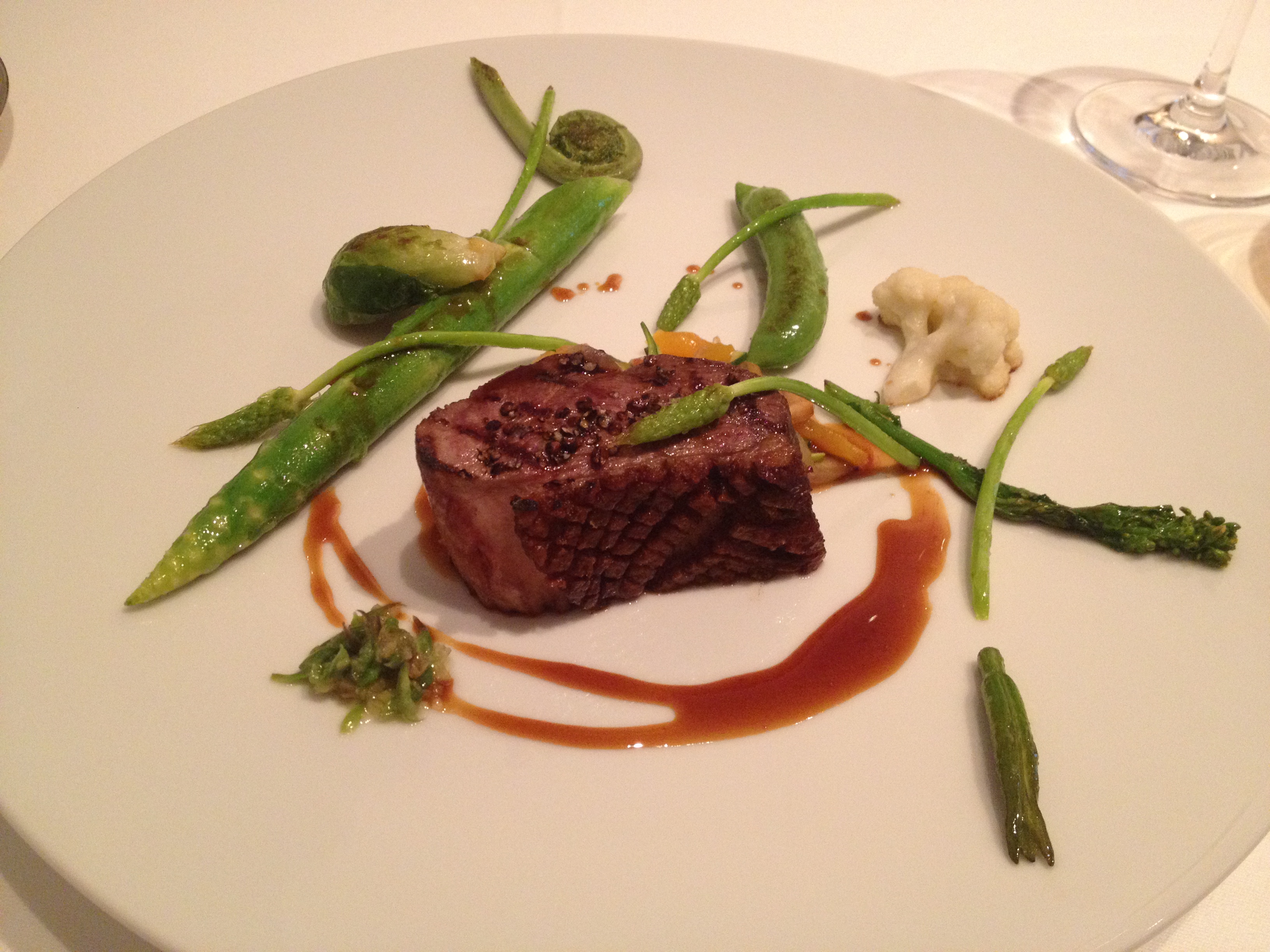 The next course was much more to my liking! It was a perfectly cooked duck breast with assorted fresh vegetables including asparagus and sugar snap peas. The presentation was artful and it definitely tasted delicious.