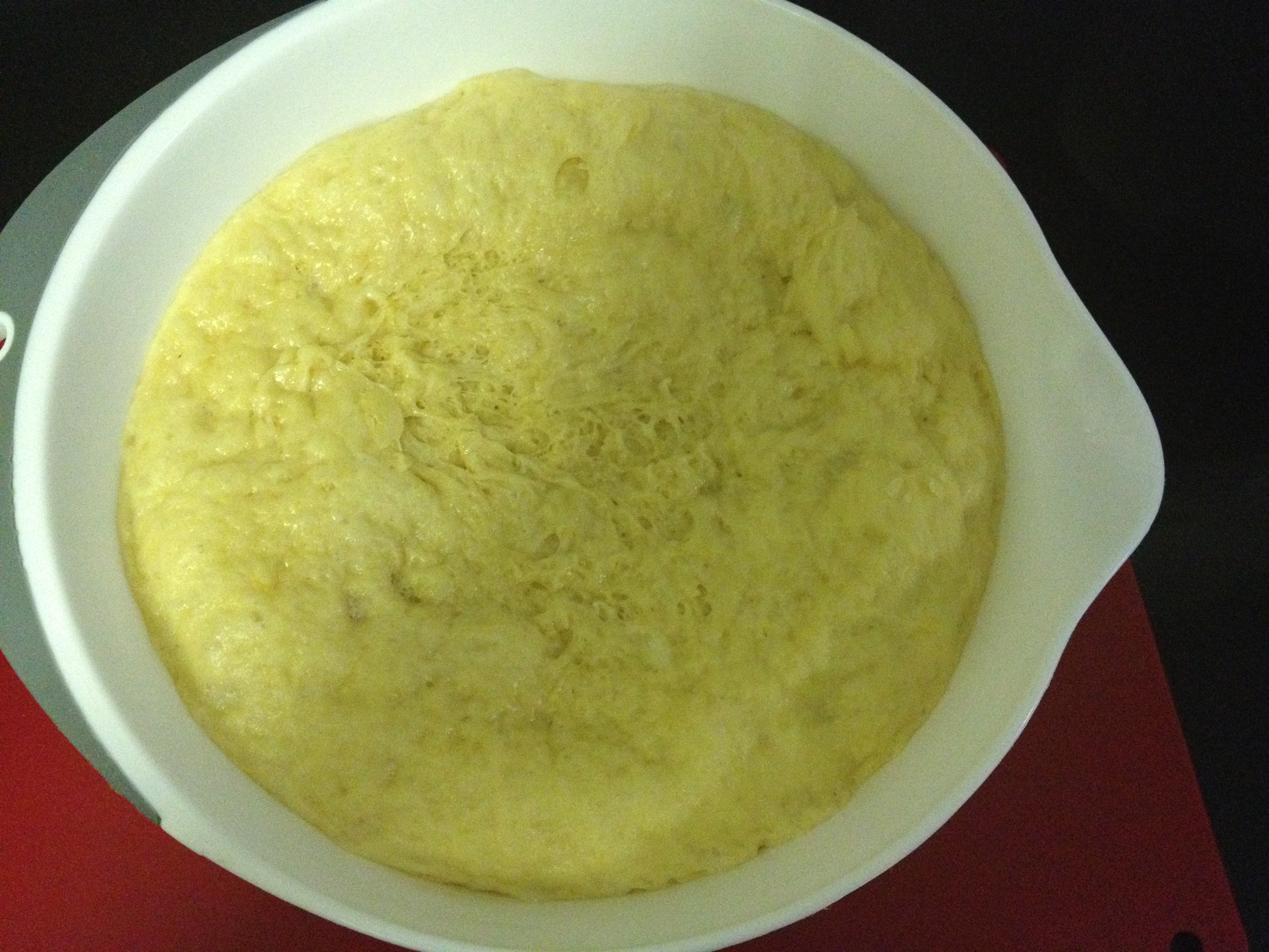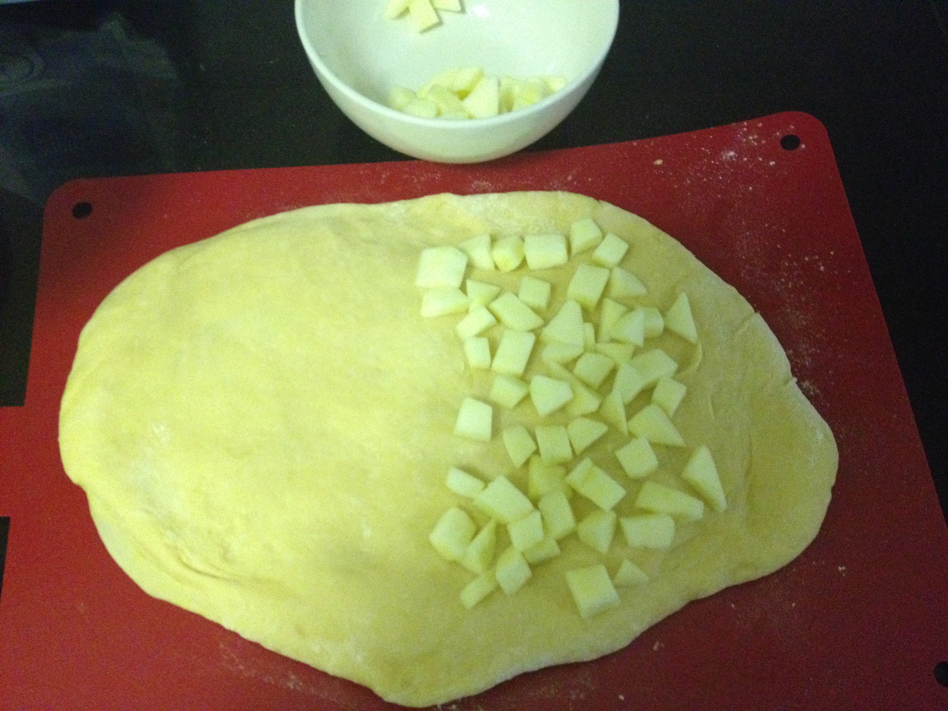 Once the dough has risen, turn it out onto a floured counter and gently press it down into a flat, oblong shape – don’t worry too much about the exact size of it though. Spread 2/3 of apple chunks over 1/2 of the flattened dough. Fold the other half over the apple chunks and press the dough down around them, flattening the now lumpy dough. Spread the remaining 1/3 apple chunks over half the folded dough. Fold the other half over the apples, pressing the dough down again. Your dough packet will likely be square-ish. Fold the corners under with the sides of your hands and form the dough into a round. Upend your empty bowl over it and set it aside for another 30 minutes or so. (If this makes no sense go to the original post in the link above and see the photos – it’s not actually that hard to do.)