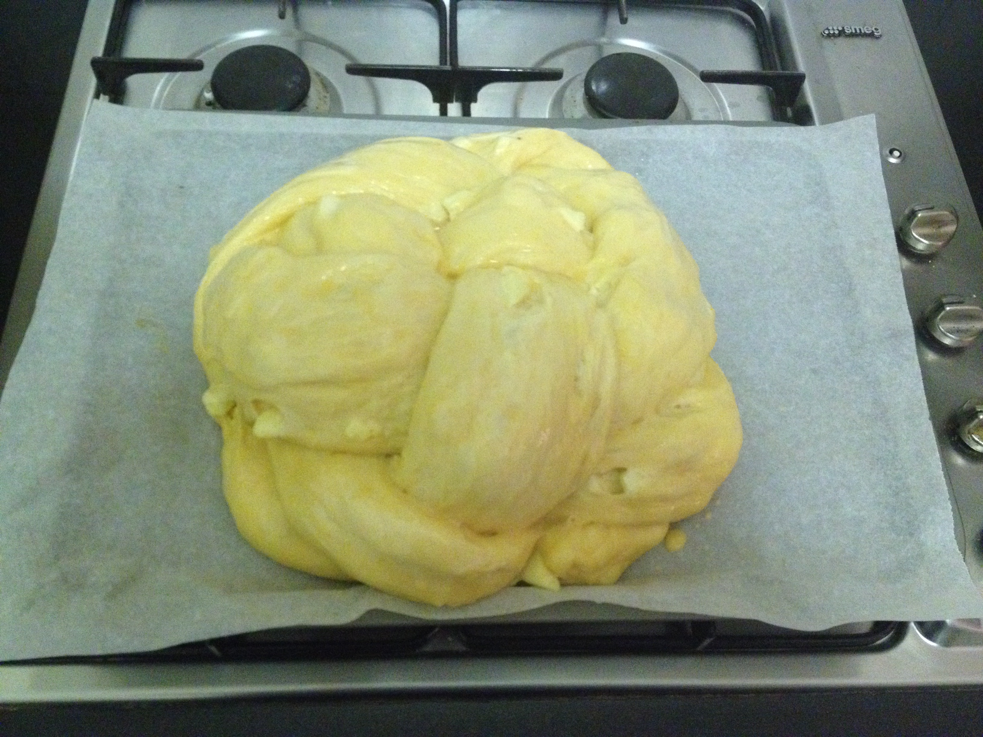 Make the dough by adding the yeast and 1 teaspoon honey into 2/3 cup warm water and let stand until foamy, a few minutes. Then pour in the oil, the remaining honey, eggs, and yolk and combine. Add the flour all at once and stir it up until you get a big mass of dough. Turn dough out onto a floured counter and knead it into a smooth, elastic dough, about 5 to 8 minutes. Try to use as little flour as necessary when kneading the dough; you don’t want to toughen the bread. There always tends to be a lot of flour in the bottom of the bowl so I make sure to dump that out on top of the bread when kneading it. It will be a bit sticky but it should come together. Once it has, transfer it to a large oil-coated bowl, cover with plastic wrap, and set aside until it rises – at least 1 hour. I don’t tend to time my risings since I think all levels of risen bread are excellent.