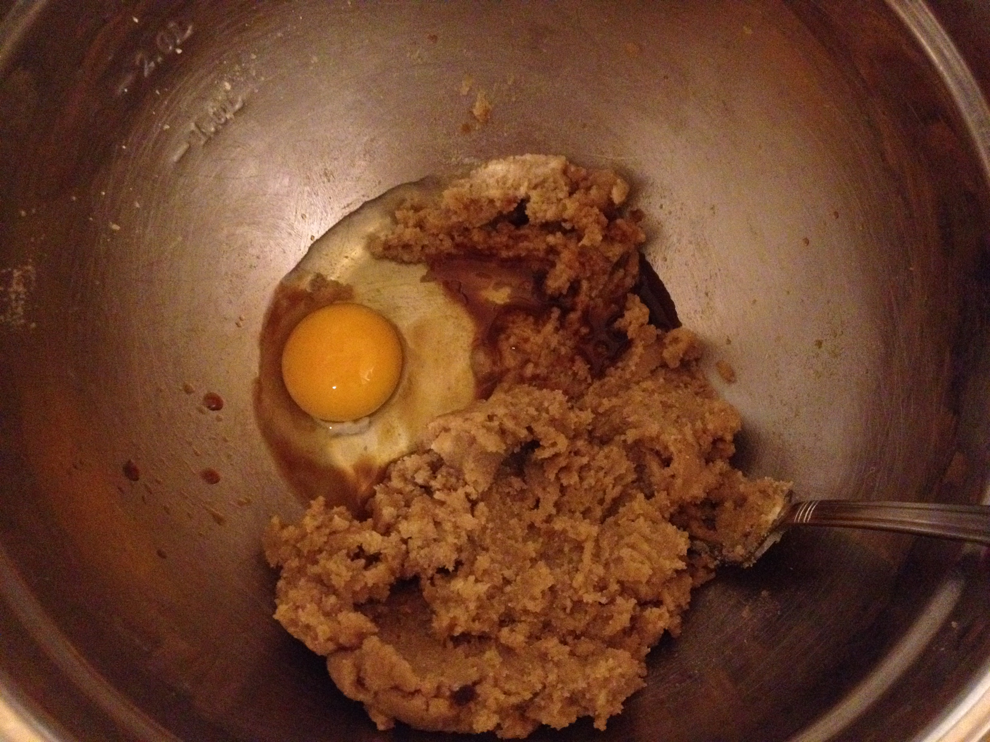 Adding the egg and vanilla extract to the creamed butter and sugar mixture