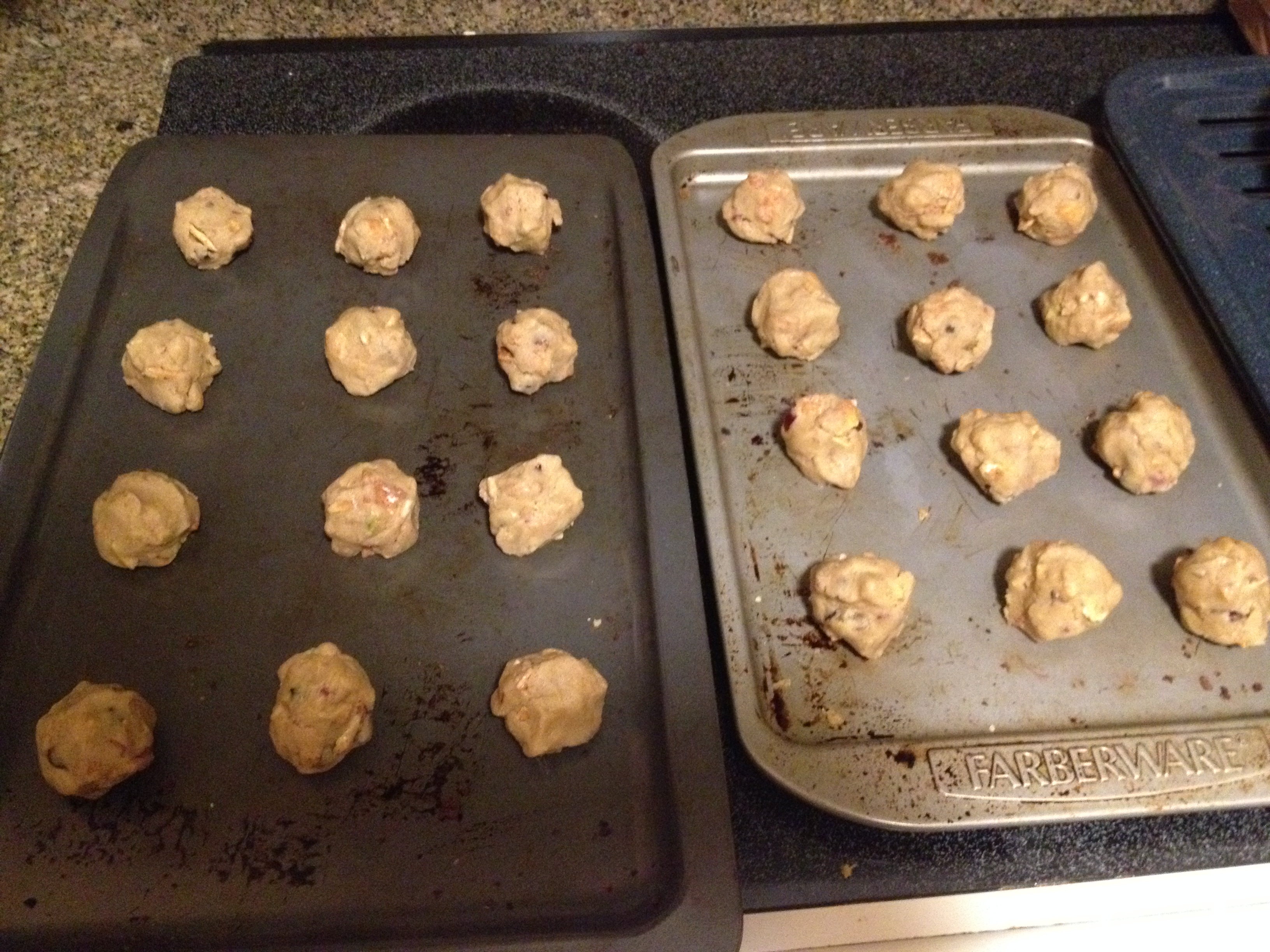 When your add-ins are ready, add a full cup of flour to the mixture, followed by the add-ins. Then add in more flour until the mixture becomes enough of a dough so that you can scoop up little balls of it with your hands. You can pop it in the fridge at this point to harden more (and it will keep in the fridge tightly wrapped for several days – although I don’t recommend this because you will just eat all the dough and not make it into cookies), or you can bake the cookies right away. If you choose the latter option, preheat the oven to 350 F / 180 C and then bake them on parchment lined sheets (if possible – you can put them straight on the cookie sheet too if you want) for about 10 minutes. Start checking at 8 in case your oven runs hot. The baking time is also kind of up to you – 10 minutes should produce a fairly chewy cookie, but they definitely harden up as they cool and into the next day. If you bake them on the longer side, it will produce a crispier crunchy cookie, which is not a bad thing – I just prefer them on the softer side. When you remove from the oven, try to let them cool for about 3-5 minutes before diving in…but if you can’t, I understand.