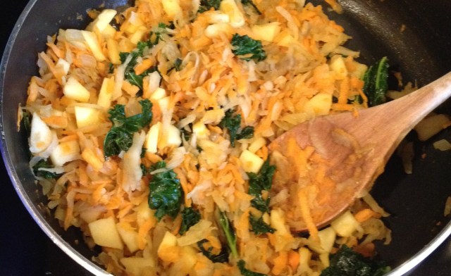 In a large pan, heat the olive oil over medium heat or just spray a pan with non-stick spray. Add the onion and a bit of salt and pepper and sauté until it softens, about 3-5 minutes. Then add the grated sweet potato and cook for a couple minutes more. Finally, add the apple pieces and any other cooked veggies if you’re using them. (For instance, I had some sautéed kale from another recipe that I added in at this point) You don’t need to cook all the veggies though – you can always add a raw broccoli floret or cherry tomato to the top of the egg cup before putting it in the oven.