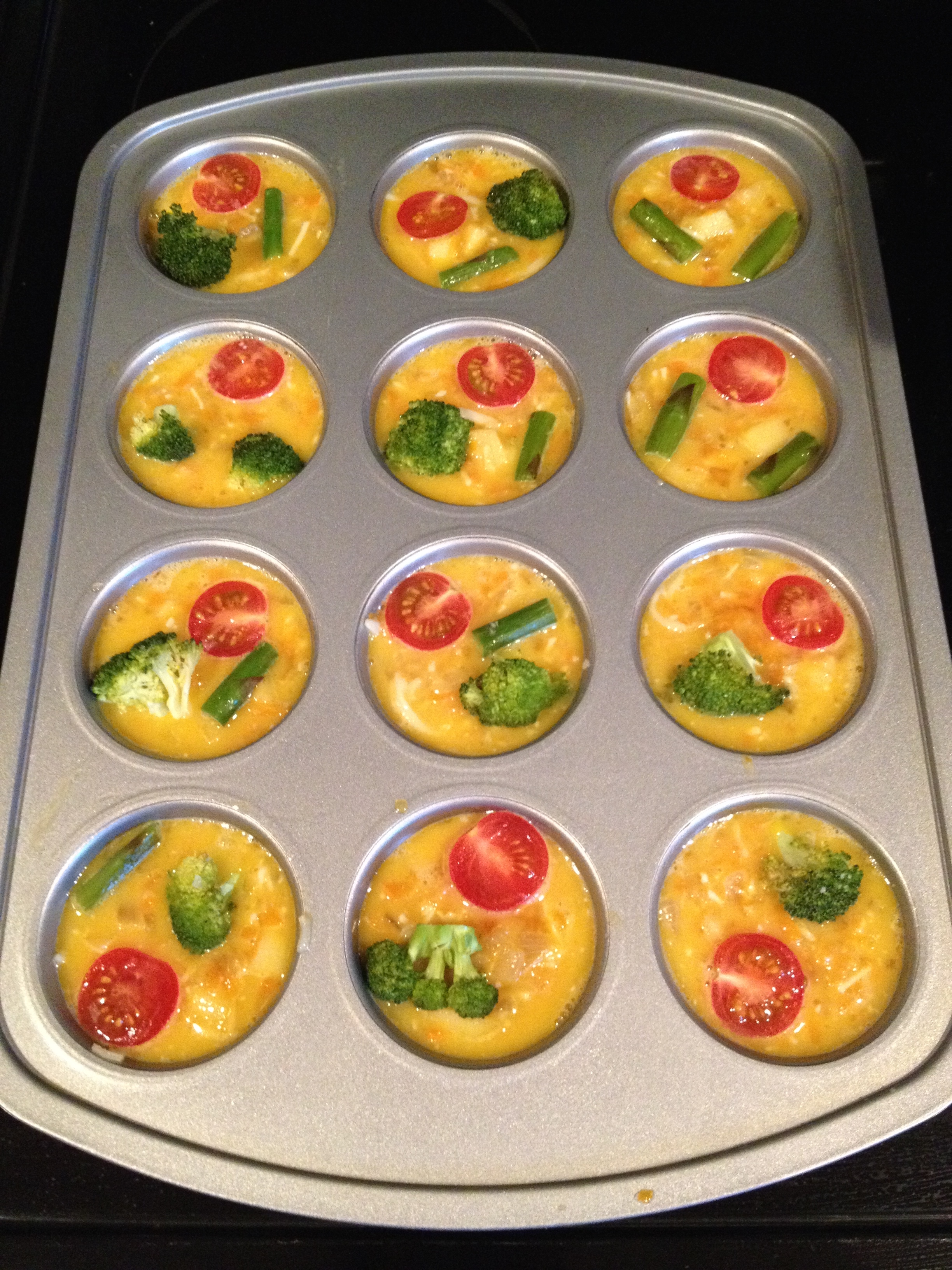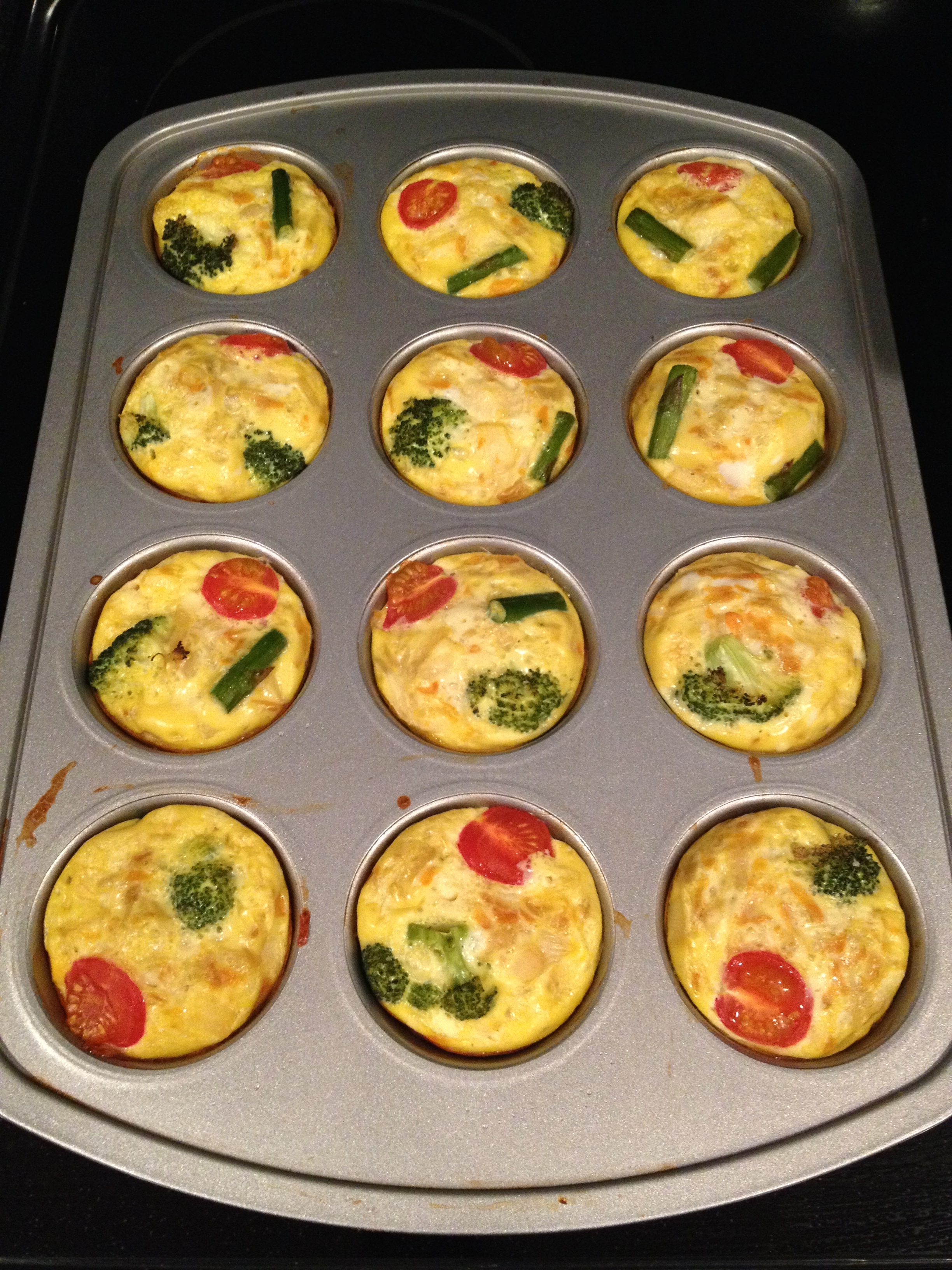 Preheat the oven to 350 F / 180 c and lightly grease or spray two muffin pans if making the full recipe, or just 1 if making the half recipe. In a large bowl, whisk together the eggs (and egg whites if using), a pinch of salt, and a pinch of nutmeg. Stir in the mixture of goodies from your pan and combine thoroughly with the eggs. At this point you can add a handful of shredded cheese if you want, or you can just sprinkle some cheese on the top once you put it in the muffin pans. Once everything is mixed, divide it evenly among the muffin cups. Sprinkle with more cheese if you want, or top each cup with an artful vegetable piece. Bake for 18-22 minutes, or until the eggs are set and the top is lightly golden brown. These are delicious hot, room temperature, or even cold!