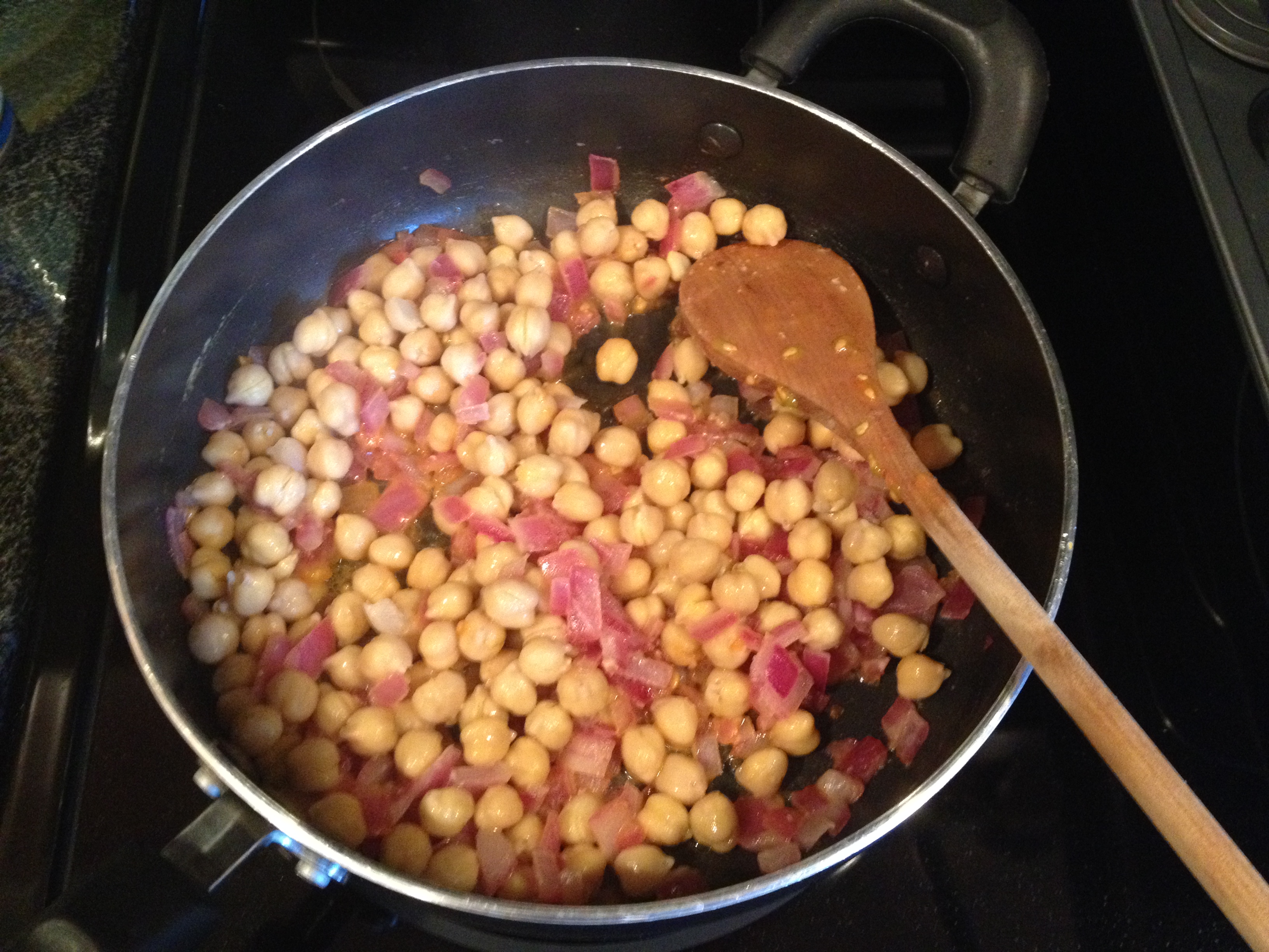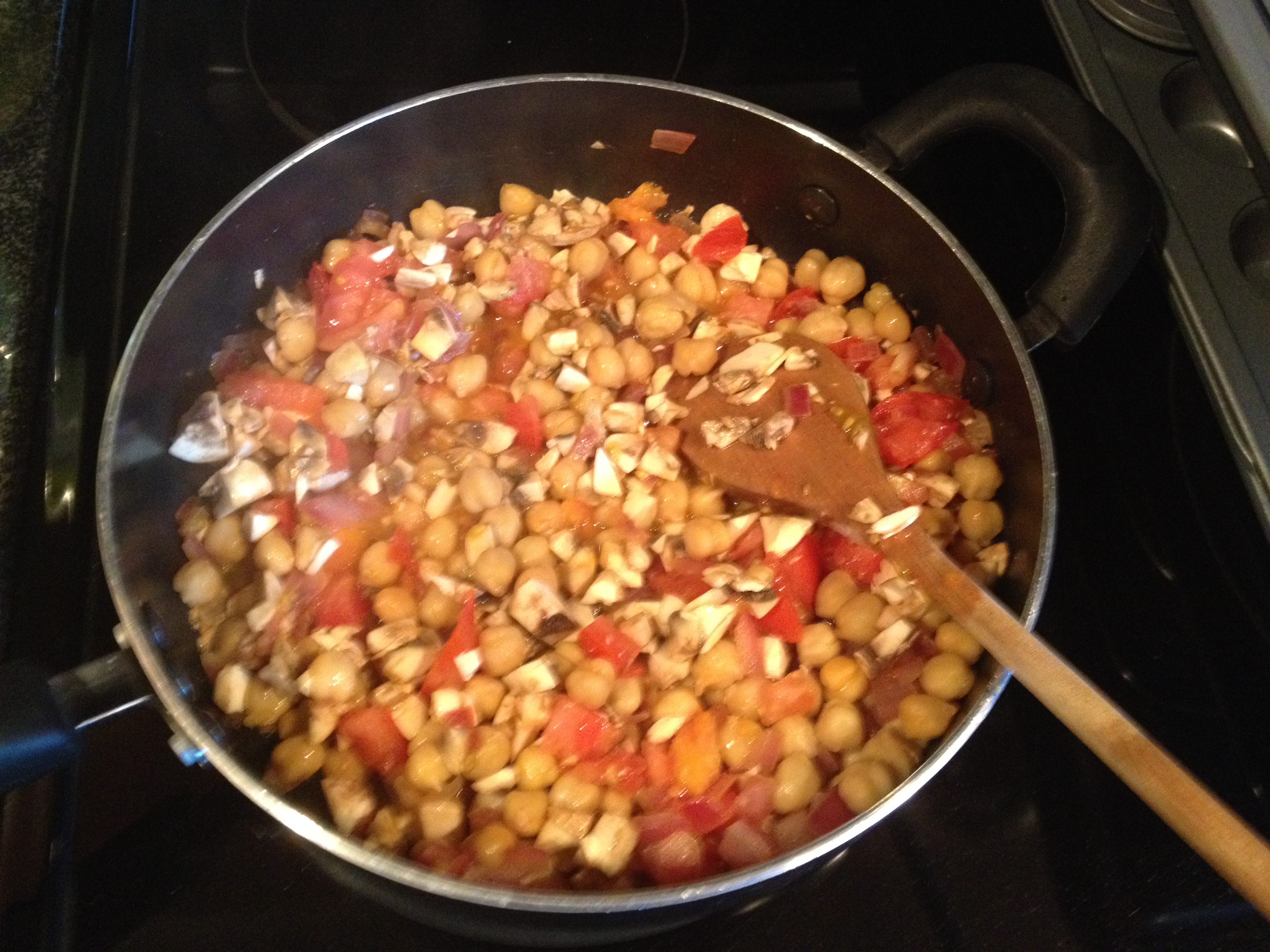 Crush and chop the garlic finely (or squeeze some out of your handy tube) and sauté it with the diced onion in a pan for 3-5 minutes, until they become soft. Then add the insides of the tomatoes, the chickpeas, mushrooms, and olives (if using) to the pan. Turn down the heat to low and simmer for another 5-7 minutes or until the liquid has significantly reduced. Keep an eye on it and stir it frequently.