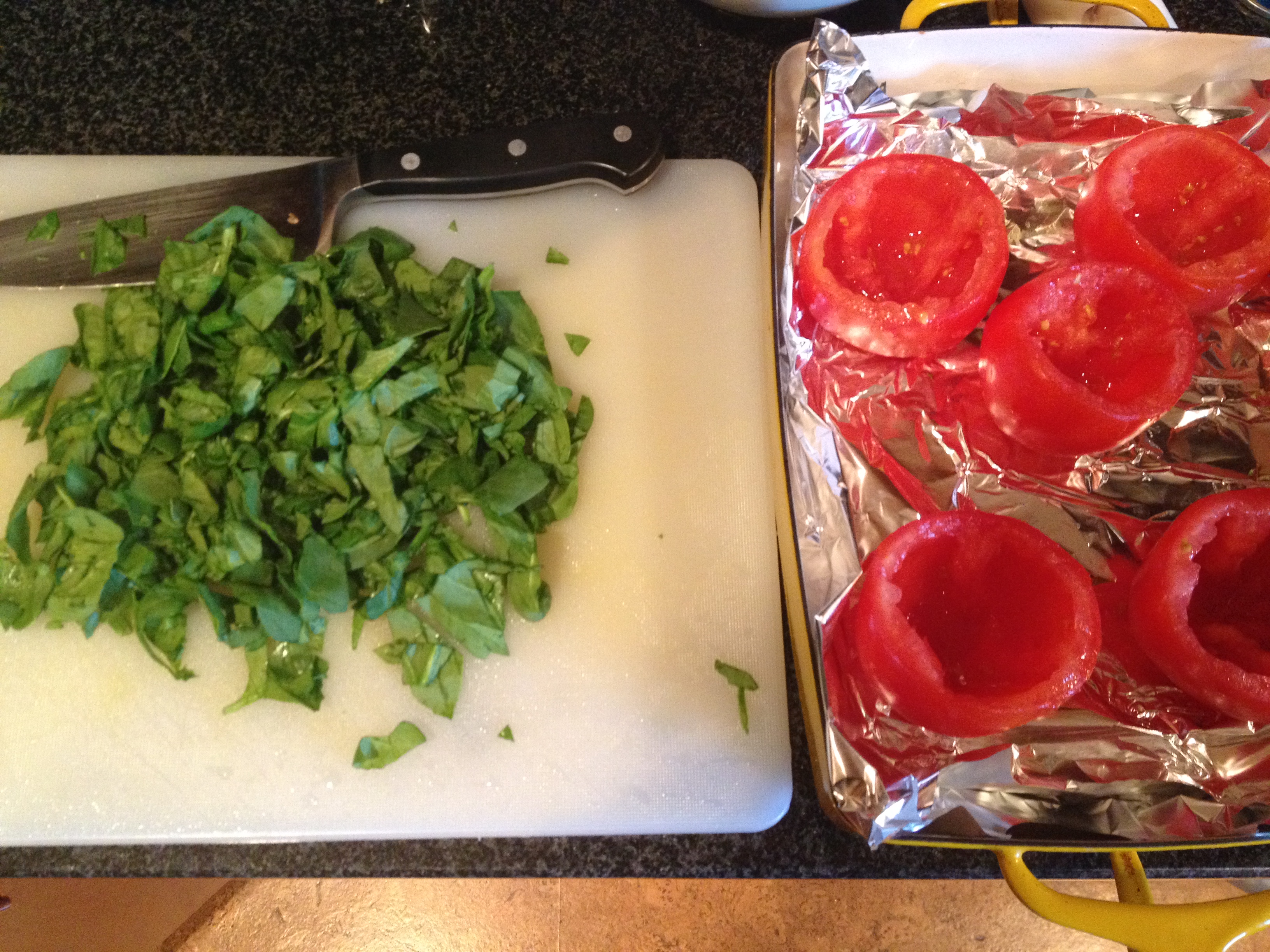 Preheat the oven to 350 F / 180 C. Cut the tops of the tomatoes off and scoop out all the flesh and seeds, but set them aside for use in the recipe. Place them upside down on a plate to drain while you are preparing the other ingredients.