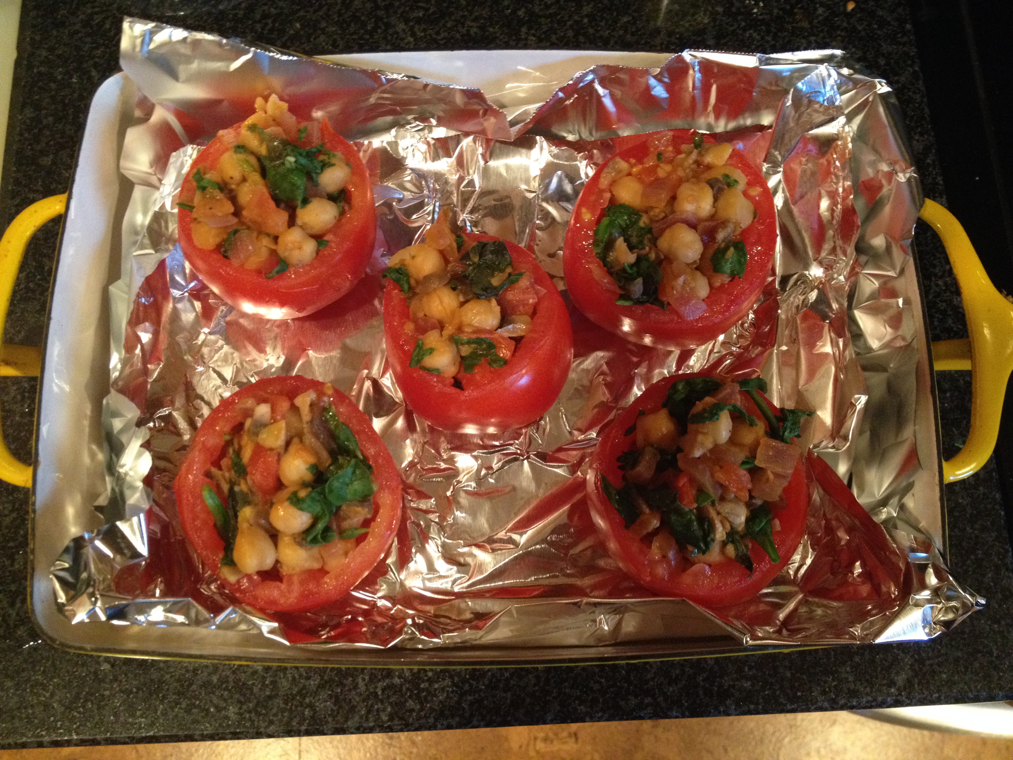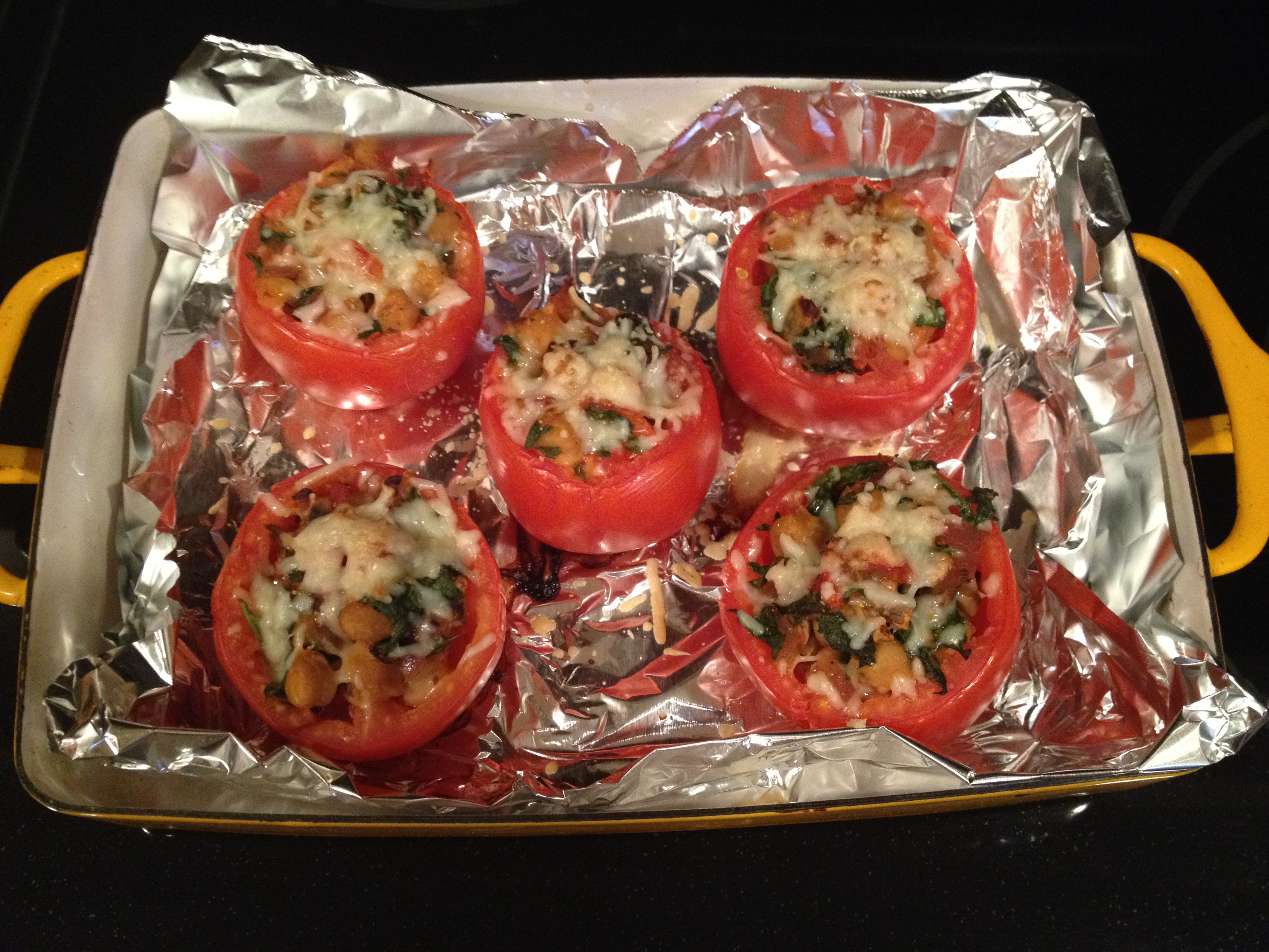 It’s been a while since I’ve done a stuffed veggies dish and when I saw this one I had to try it immediately. I love tomatoes, especially in the summertime, and the mix of goodies that went into this one looked amazing. As you all know I have a slight obsession with chickpeas (really, almost all vegetarian recipes just taste better if you add chickpeas) and the combination of chickpeas with other healthy goodies like mushrooms and spinach is delicious. Add basil and parsley and the juice of the tomatoes that you stuff and you get a mixture full of really fresh simple flavors. I definitely got excited about the stuffing and cooked up too much for the available tomatoes I had, which is totally fine as you could just eat the stuffing with a spoon. Or, just get some extra tomatoes to stuff.