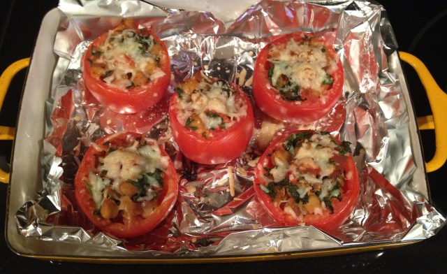 Once the mixture is tender, remove from heat and add the spinach, basil and parsley. Season it with salt and pepper to taste. Finally, stuff the tomatoes with the mixture. Place them on a baking sheet covered in foil and bake for 10-15 minutes. I chose to take mine out halfway through the baking time and sprinkle with shredded parmesan cheese, which browned nicely once the tomatoes were done. Serve warm.