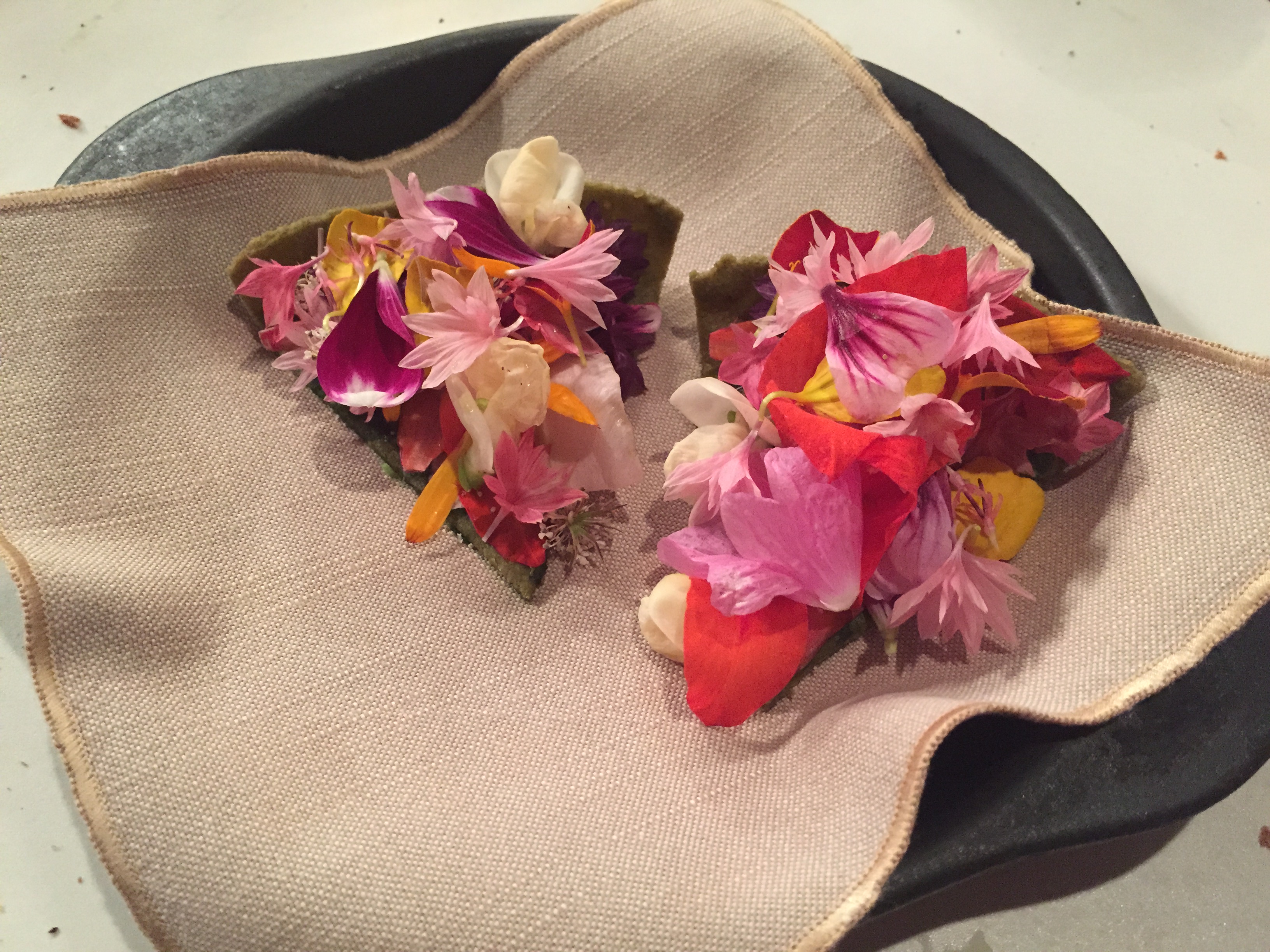 Next up: little pieces of raw shrimp wrapped in nasturtium leaves. Isn’t it cute how they look like little lillypads? Now, I’ve never had raw shrimp before, but this was a good place to start. Yes, the texture is a bit odd, but it was so cute that I enjoyed it.