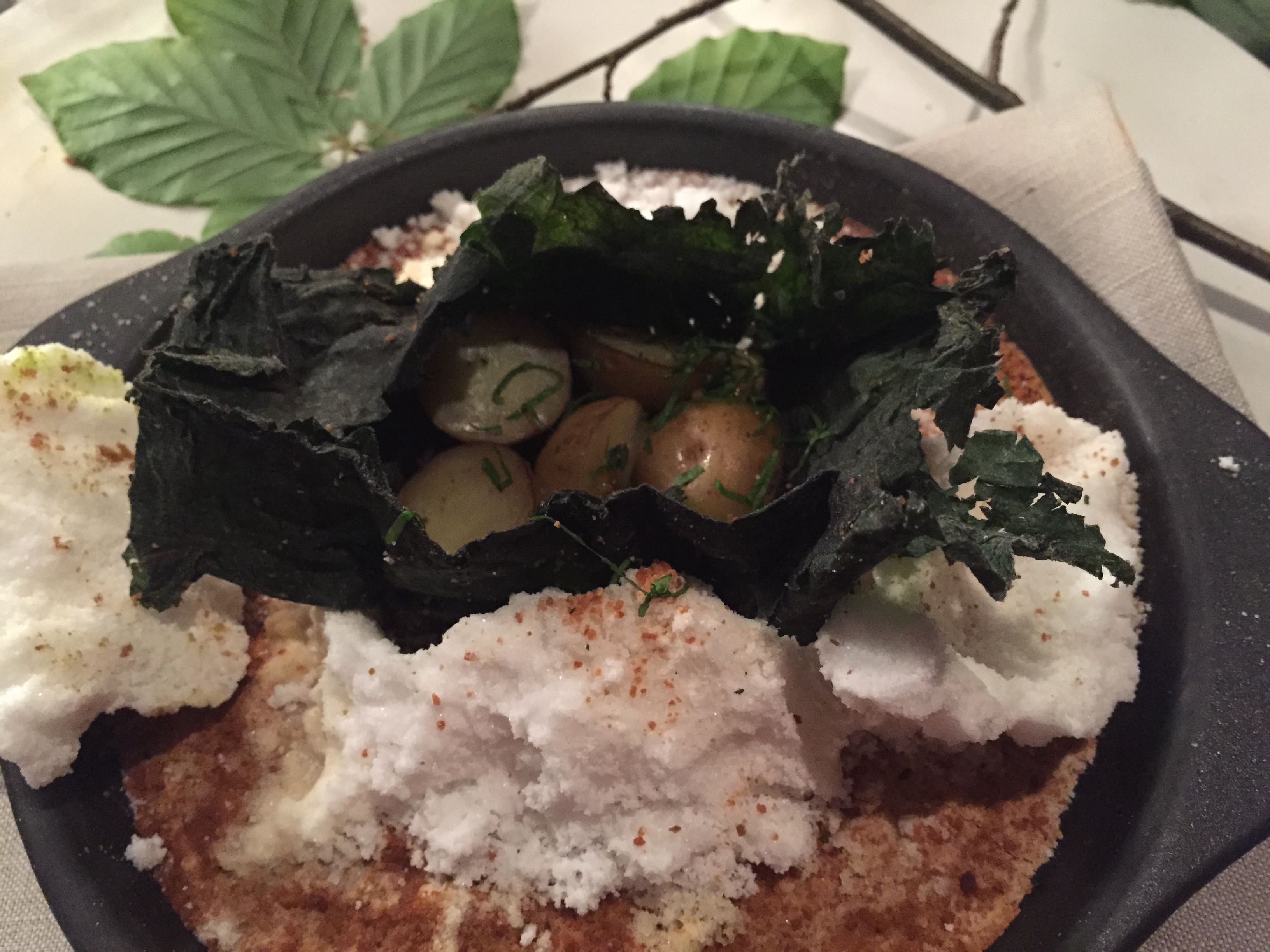 And then the nettle leaves in the middle opened to reveal some potatoes, which was the only edible part of the dish, and we had to eat the potatoes with the sharpened stem of the branch. This was incredibly fun but yes, also absurd. The potatoes were delicious though.