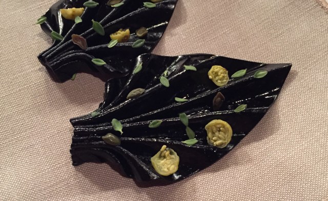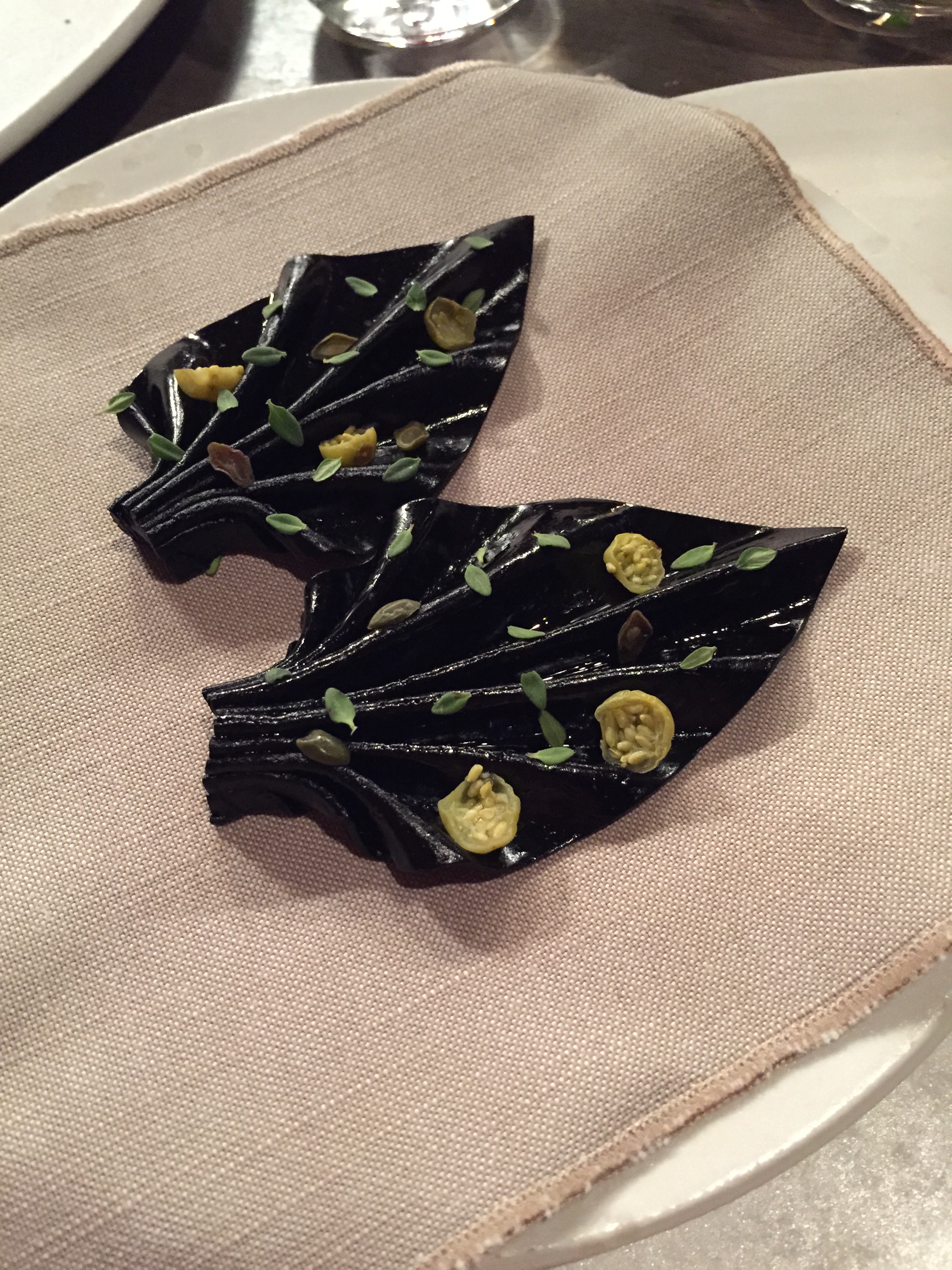 Get ready for this one. This beautiful looking fan is created entirely from black garlic, which they somehow boil down and work into a sheet-like form. Think fruit roll-ups (that very American dessert that people ate as kids), but instead of being fruity, it was like a sheet of pure black garlic that they then folded into fans. On the top part were little flowers and herbs, and on the back (not pictured), were TINY ANTS. Yup. They take a sheet of ants, pour liquid nitrogen over them to freeze them solid (and kill them I guess?) and then delicately place them on the back of this fan. Yes, you can see them so this made it a bit less appetising for me. It was also very intensely garlicky, so I really could only manage one bite of this one. But in concept the dish is fascinating!