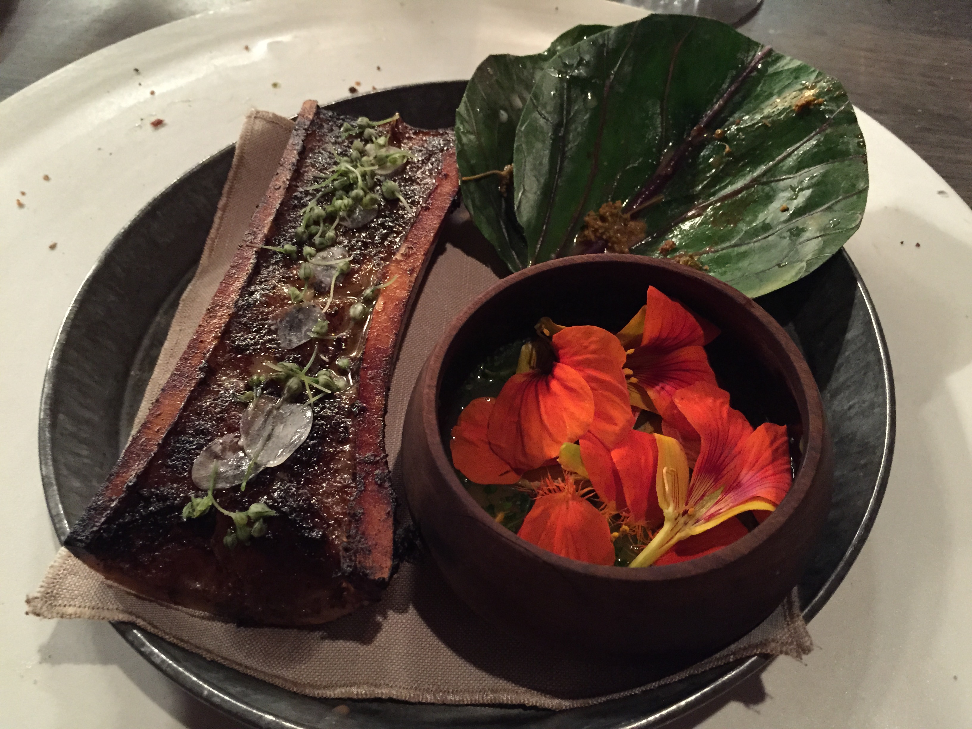 Getting a little more adventurous now – this was sweet peas, some milk curd, a bit of a seaweed sauce, and that brown stuff on the top is sliced kelp. The peas were actually divine. Apparently some chef intern literally hand shucks ever single one of them and that is their job. The milk curd combined with the seaweed was a little odd but it worked for me. The peas were definitely my favourite part though.